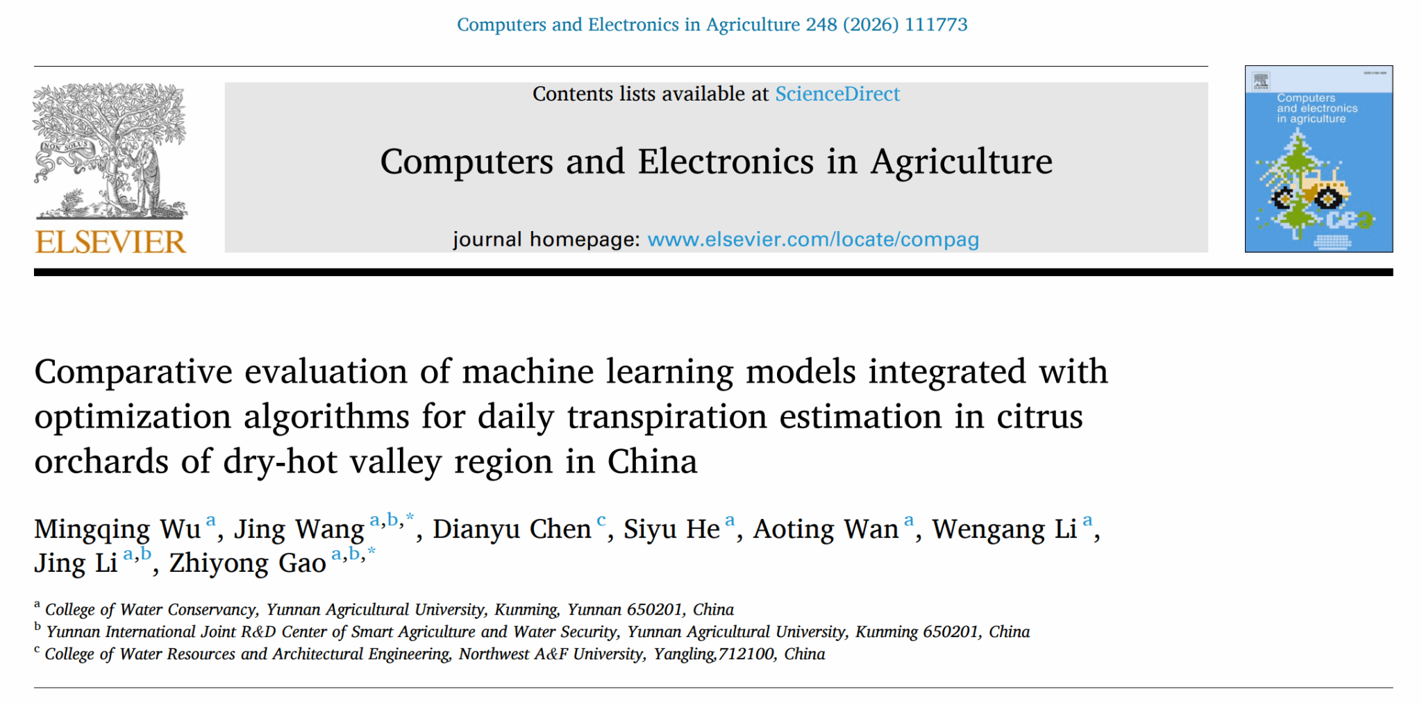 本站消息 近日,学校水利学院高志永博士团队在农林科学领域国际期刊《Computers and Electronics in Agriculture》(中科院一区Top期刊,IF=8.9)在线发表了题为《Comparative evaluation of machine learning models integrated with optimization algorithms for daily transpiration estimation in citrus orchards of dry-hot valley region in China”的研究论文。水利学院2024级在读硕士生吴明清为第一作者,高志永博士为通讯作者。...