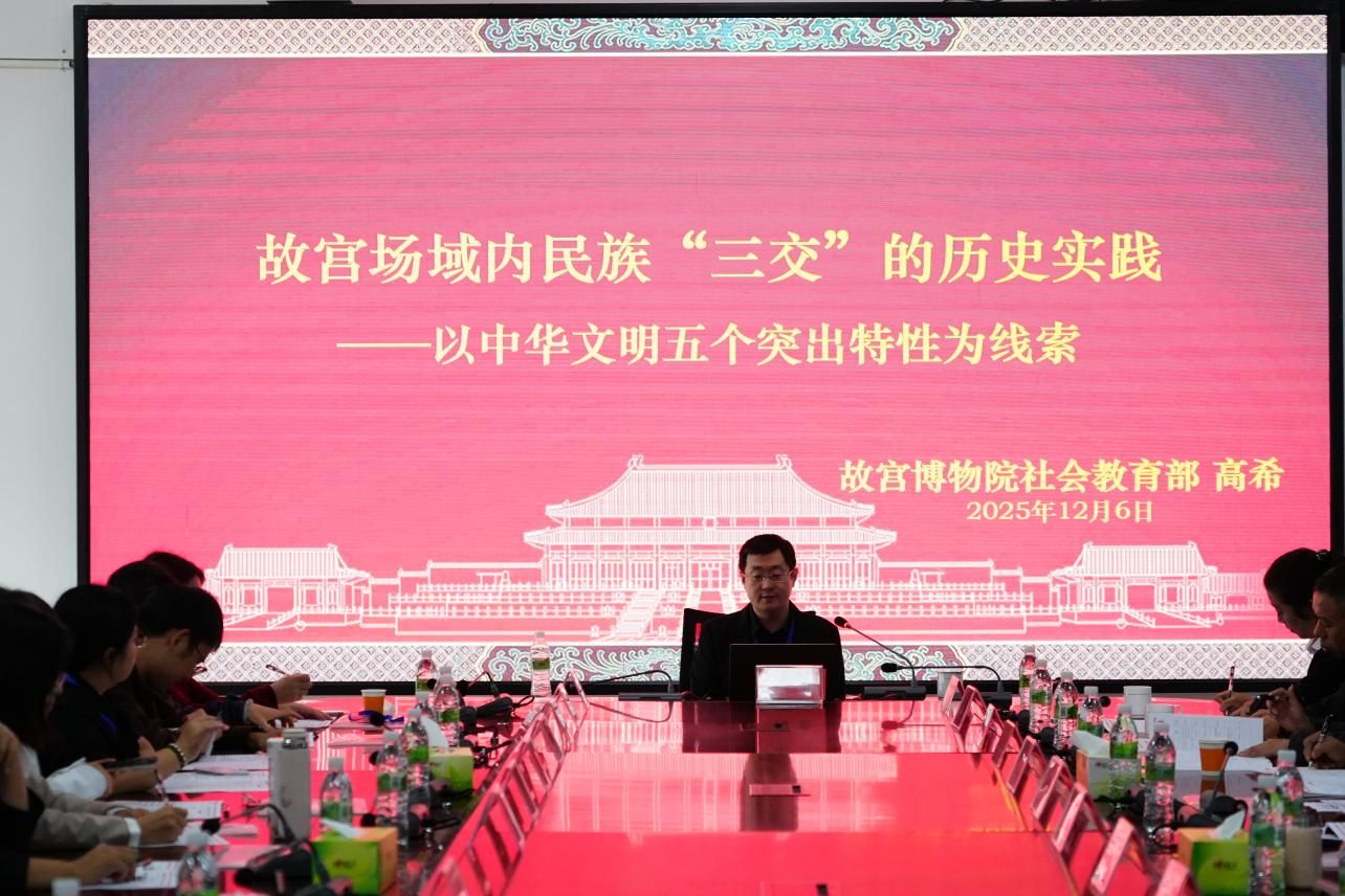 会议邀请故宫博物院副研究员高希博士,以《故宫场域内民族"三交"的历史实践——以中华文明五个突出特性为线索》为题,带来了一场兼具历史深度与时代价值的精彩分享。他从中华文明的突出特性切入,通过鲜活的历史案例与详实的文献资料,生动阐释了各民族在长期交往交流交融中形成的命运与共格局,为在场教师开展《中华民族共同体概论》教学提供了丰富的历史素材与新颖的教学视角。报告引发热烈反响,大家纷纷表示深受启发,将把这些宝贵的历史智慧融入课堂教学,让铸牢中华民族共同体意识的种子在学生心中生根发芽。