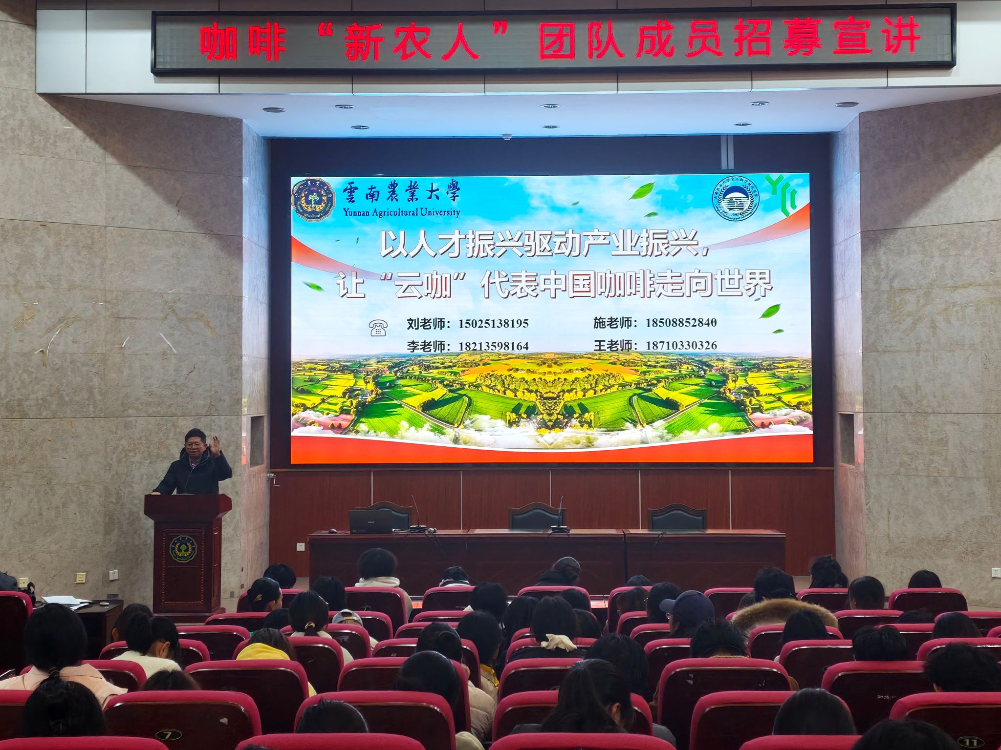 本站消息 为推进《云南农业大学关于加快培育扎根乡村一线“新农人”工作实施方案》的工作部署,把“云南咖啡还是代表着中国的”落实到教育科技人才一体化建设上,12月4日至12月7日,由副校长、咖啡科学与工程专业负责人李宏带队,食品科学技术学院牵头,联合热带作物学院、云南省咖啡现代产业学院,分别在校本部、普洱校区开展咖啡“新农人”团队招募宣讲、面试活动,全校450余名同学参加了宣讲会,参会学生涉及咖啡、食品、林学、经管、大数据等专业。