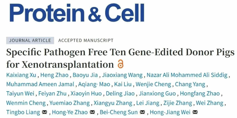 学校魏红江教授团队长期致力于异种器官移植供体猪的开发,培育了经过广泛基因工程改造、并在47种无特定病原体严格筛查条件下获取的10基因编辑供体猪。该10基因编辑猪敲除猪自身的三个基因(GGTA1、CMAH和β4GalNT2)以缓解抗原抗体介导的免疫排斥反应,同时,表达了3个人补体调节蛋白(hCD46、hCD55和hCD59)抑制人补体对猪细胞的攻击,表达3个凝血调节因子(hTBM、hEPCR和hCD39)以改善人-猪间的凝血功能障碍,表达hCD47基因以抑制巨噬细胞活化和吞噬作用。而且该10基因编辑供体猪无47种病原微生物,是目前全球已报道的病原微生物检测数量最多的异种器官移植供体猪。该10基因编辑猪也是国产首批无特定病原体的10基因编辑猪,为此,学校也是除Revivicor和eGenesis公司外,全球第三家拥有10基因编辑异种器官移植供体猪的单位。该无特定病原体的10基因编辑供体猪研究成果也于2025年8月发表在《Protein & Cell》(IF=12.8)杂志上。