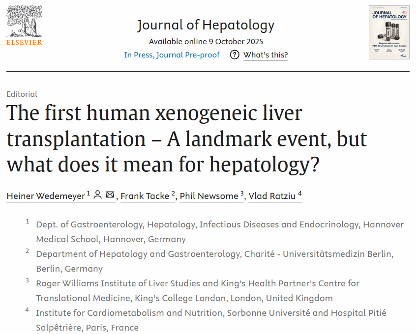 该研究是2024年5月17日在安徽医科大学第一附属医院完成的全球首例基因编辑猪到71岁晚期巨大肝癌患者的原位辅助异种肝脏移植,术后患者状态良好,未见超急性或急性免疫排斥反应。该案例报道后,Nature和Science杂志分别刊登了题为“First pig-to-human liver transplantation recipient ‘doing well’”“Pioneering pig liver transplantation”新闻报道,领域内的权威专家David Cooper(异种移植领域免疫学家、开创者、奠基人)、Jay Fishman(波士顿马萨诸塞州总医院移植传染病专家)、Burcin Ekser(印第安纳波利斯印第安纳大学医学院移植外科医生),高度评价了该例肝脏异种移植手术的开创性意义。