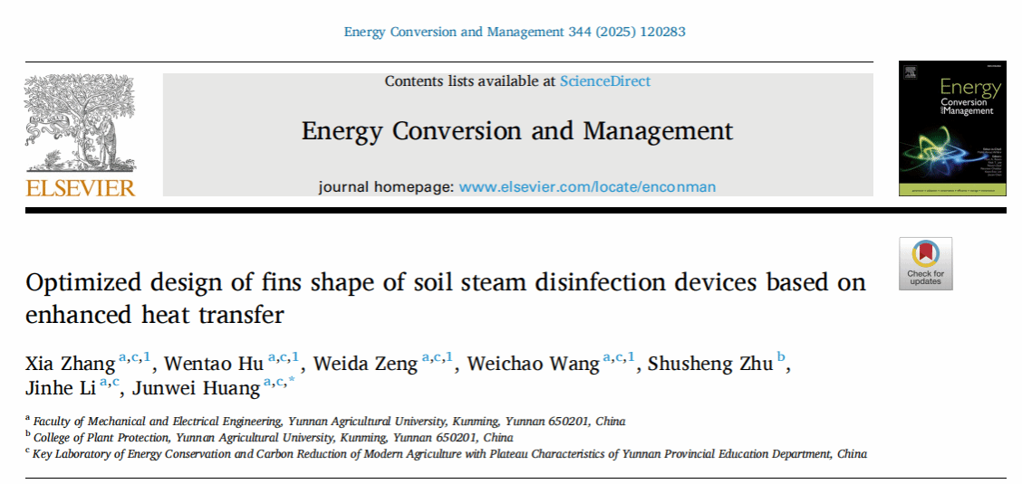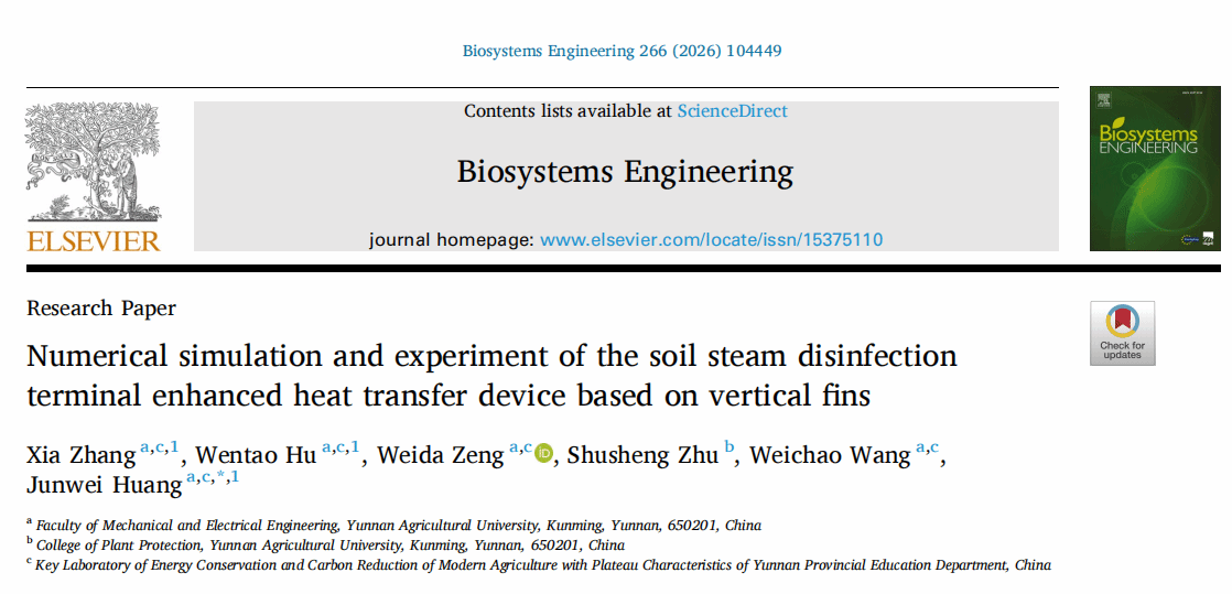 本站消息 近日,学校黄峻伟教授团队在设施农业绿色消毒关键技术领域取得系列突破。针对土壤蒸汽消毒过程中长期存在的蒸汽扩散不均、土壤升温效率受限和能耗偏高等行业共性难题,团队在国际上率先将翅片结构引入土壤蒸汽消毒蒸汽输出装置设计,并围绕装置结构开展持续优化研究,逐步形成了从原始结构创新到高效能设计的系统化技术体系,揭示了翅片结构对蒸汽扩散和土壤温升的强化作用规律。相关研究为节能型土壤蒸汽消毒系统设计提供了理论基础,对缓解设施农业土壤连作障碍、推动土壤可持续管理具有重要意义。研究成果相继发表于农业工程领域国际权威期刊Biosystems Engineering(中科院1区TOP,IF: 5.3)和能源领域国际权威期刊Energy Conversion and Management(中科院1区TOP,IF: 10.9)。