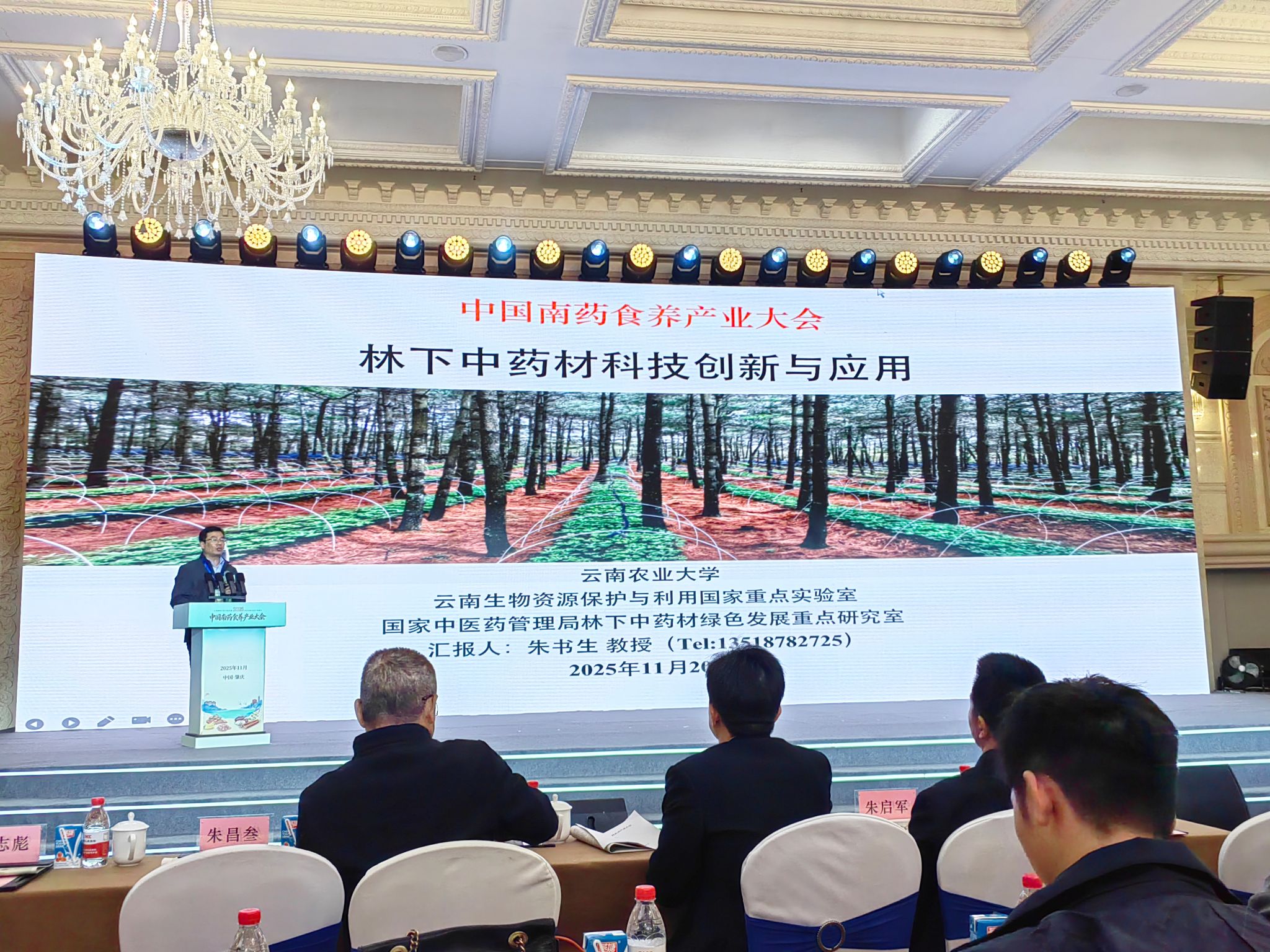 朱书生在大会上作“林下中药材科技创新与应用”主题报告,以林下三七为案例分享学校在林下中药材开展的科学研究及取得的应用实践。他给出了以生物多样性和生态平衡理论为依据,从生境耦合(环境平衡)、物种互作(群落平衡)、逆境胁迫(代谢平衡)三个维度提出发展南药产业的“云农”路径,并提出了基于得天独厚的云南丰富森林资源条件,构建起胶林下集南药种质资源保护、良种繁育、种植、加工、研发、应用与健康服务于一体的完整产业体系的建议。