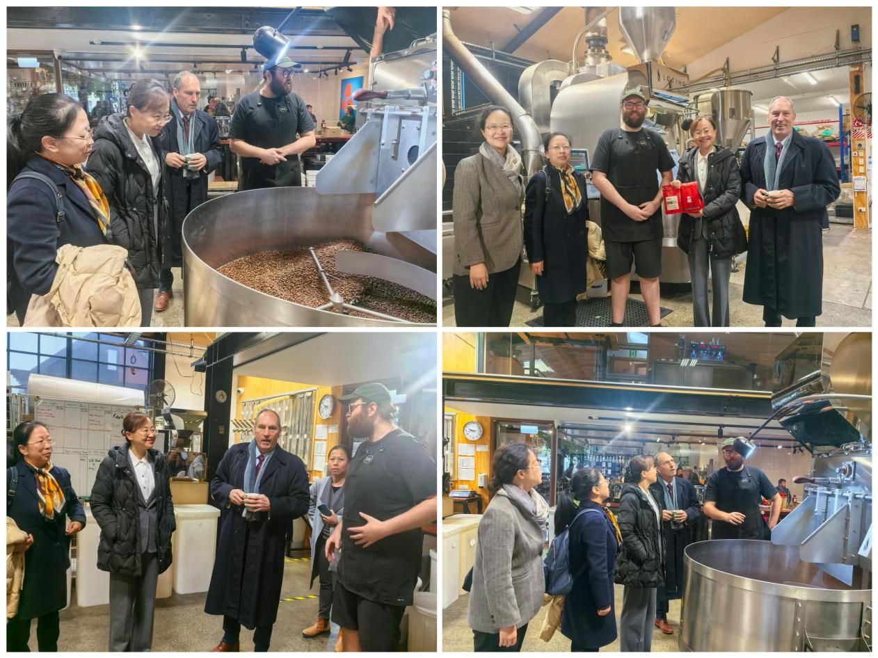 代表团延续与林肯大学合作农林经济管理专业教授产业链相关课程成果,访问了新西兰南岛闻名咖啡企业C4,介绍云南咖啡产业和学校咖啡专业相关情况并赠送云南精品咖啡豆。