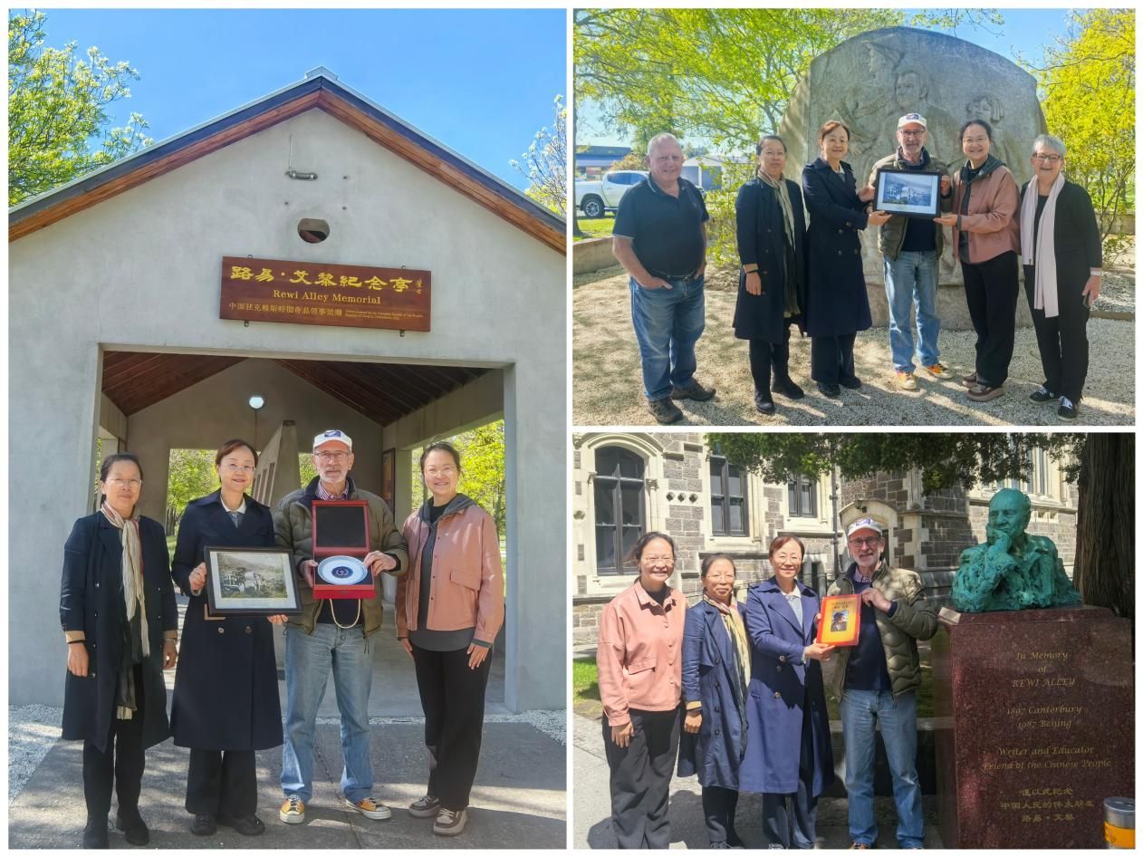 代表团访问了新西兰原国际主义友人路易·艾黎(Rewi Alley)纪念亭,新中友好协会全国副会长大卫·亚当森(David Adamson)全程参加并进行了详尽介绍,转达艾黎中国养子邓邦镇先生赠送“艾黎在云南”照片,赠送《Rewi Alley: from Canterbury to China 路易·艾黎:坎特伯雷到中国》一书。艾黎是中国革命与建设的坚定支持者,20世纪30年代在华创办“工合”运动支援抗战,并长期致力于中新友好。他毕生奉献中国,尤其在教育、科技领域影响深远。此次访问旨在传承艾黎精神,续写中新友谊与人文交流新篇章。