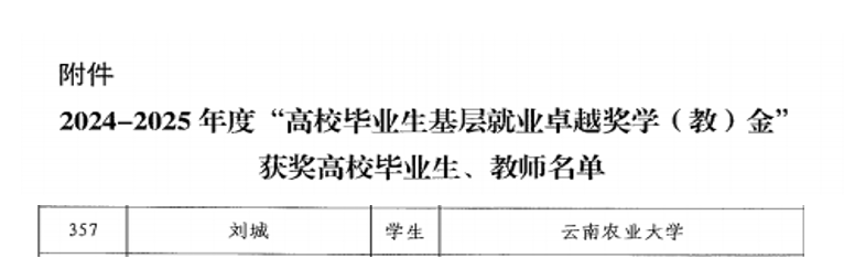 本站消息 近日,教育部公布了2024-2025年度“高校毕业生基层就业卓越奖学(教)金”获奖名单,学校动物科学技术学院2019届养殖专业硕士毕业生刘城荣获该奖项。“高校毕业生基层就业卓越奖学(教)金”于2023年设立,旨在落实党中央、国务院关于引导和鼓励高校毕业生到基层就业的决策部署,表彰在基层就业创业中表现突出、取得显著成绩的普通高校毕业生,以及在指导学生赴基层就业工作中贡献突出的高校教师。学校在前两年的评选中共有1名教师和2名毕业生荣获该奖项,同时也成为连续3年荣获该奖项的3所云南高校之一。