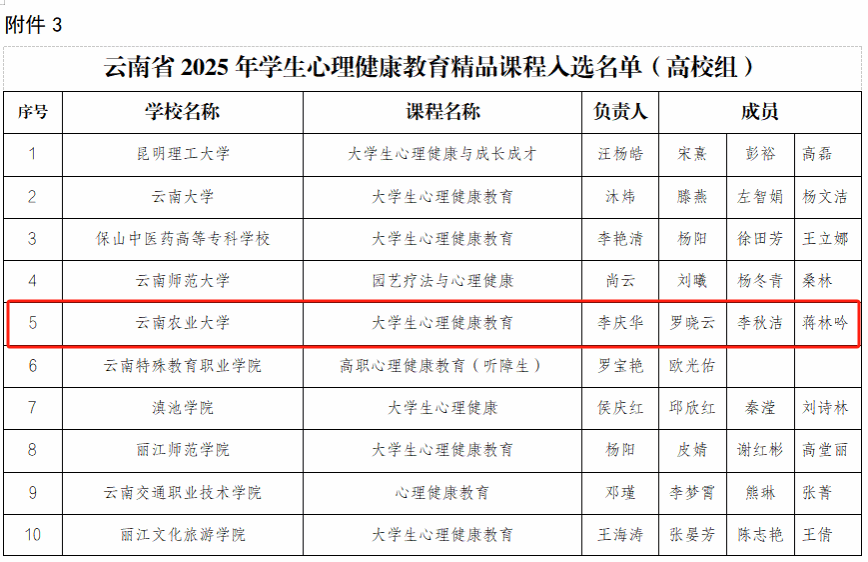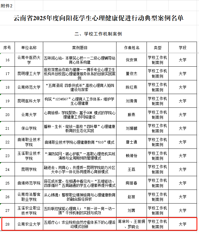 学校心理剧作品《超我觉醒 AI沉默》荣获第十四届大学生心理情景剧比赛二等奖;工作机制案例《五感疗心:农业院校自然疗愈体系下的心理活动模式创新》入选向阳花学生心理健康促进行动典型案例;《大学生心理健康教育》入选云南省2025年学生心理健康教育精品课程(高校组)。