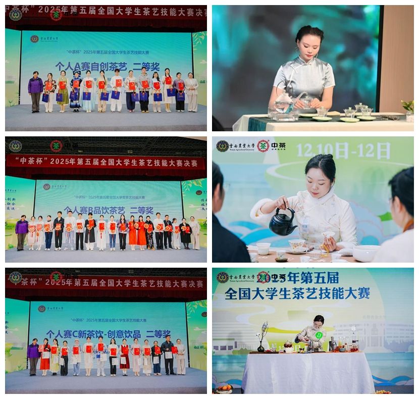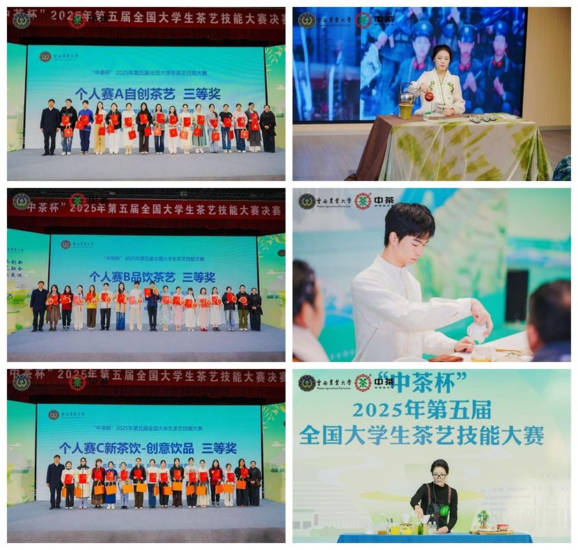 三等奖方面,2023级茶学专业本科生罗雪获个人赛A类型(自创茶艺)三等奖,2023级茶学专业本科生张锦楠获个人赛B类型(品饮茶艺)三等奖,研究生常润润获个人赛C类型(新茶饮—创意饮品)三等奖。