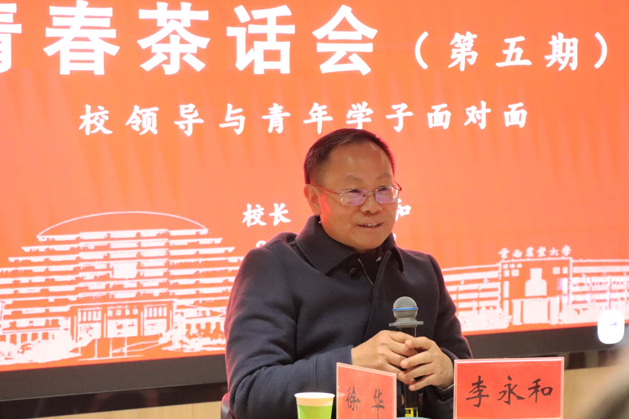 本站消息 12月1日,学校在学生社区举办了以“对话·成长”为主题的“青春茶话会”校领导与青年学子面对面活动。校长李永和、校党委副书记徐华与联系班级和各学院的40名学生展开对话交流。