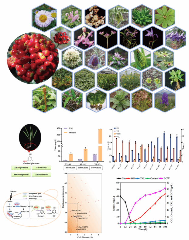 中药材科技创新团队依托国家级和省级平台,聚焦云南道地药材关键共性技术,取得系列突破。团队累计选育药用植物新品种110个,数量居全国首位,其中三七、灯盏花等良种推广超百万亩,灯盏花实现良种全覆盖;濒危药材川贝母、冰球子等实现规模化种植与资源保护。在合成生物学领域,团队(中药材师生联合党支部)依托区域植物资源优势,实现灯盏乙素、岩白菜素等药效单体高效异源合成,三年贯通“基因—酶—产物”全链条,羟基酪醇达11.9 g/L,实现了从天然提取到生物合成的关键技术跨越;建成昆明和楚雄示范线2条,支撑云南绿色生物制造集群,引领云药“智造”。