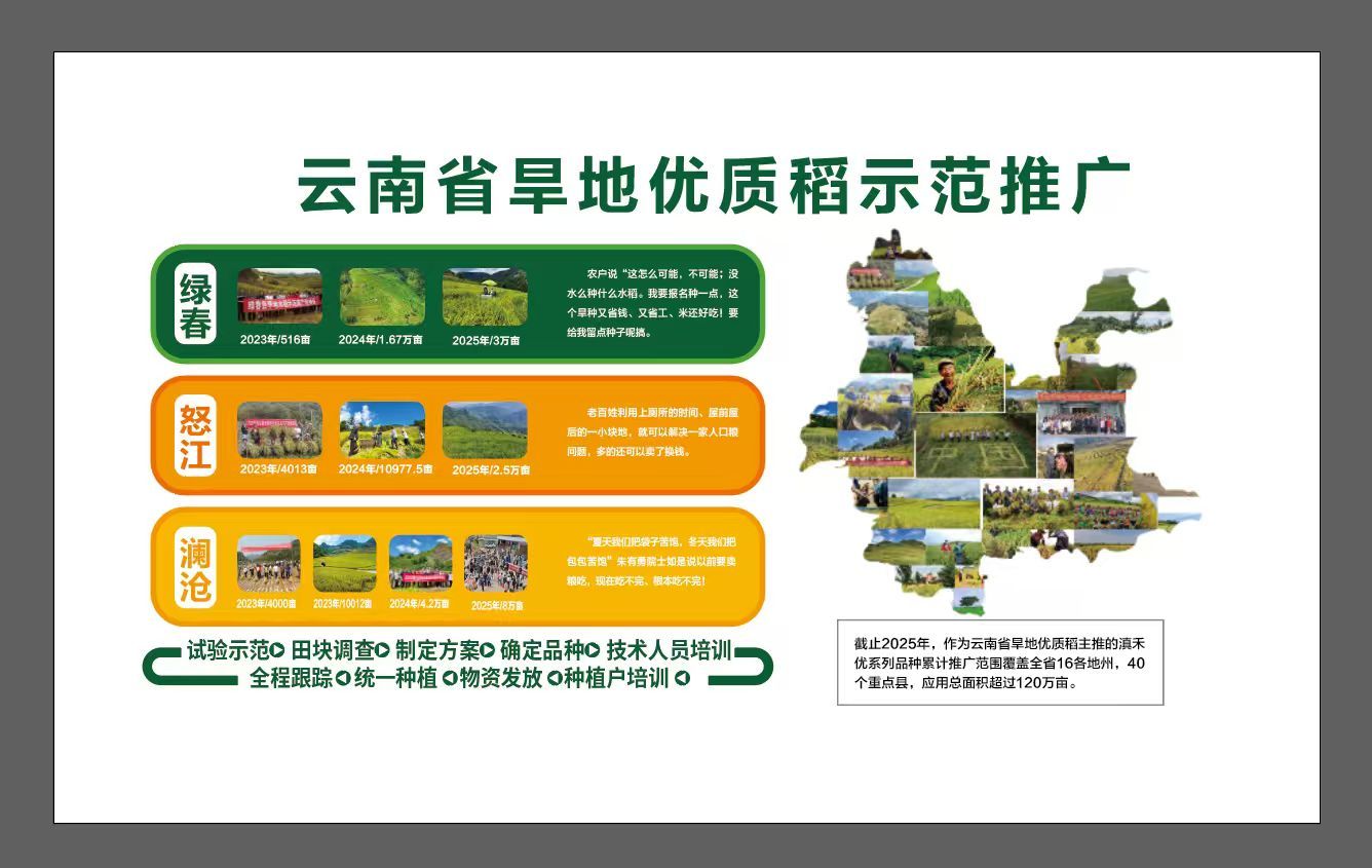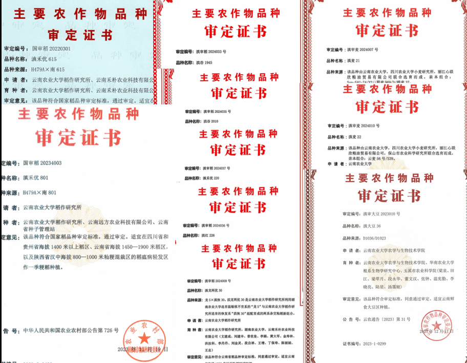 种业科技创新与产业引领突出。紧扣种业振兴,通过“科企结合”深度推动产学研融合。与云南禾朴农业科技有限公司等企业合作,助推企业跻身省级种业阵型第一梯队。育成的“滇禾优615”被认定为云南省突破性新品种,其系列品种在全省旱地优质稻推广面积中占比超70%,三年累计示范推广超100万亩,平均亩产稳步提升,被省政府认定为“云南省农业的新质生产力”。“滇薯23号”、“滇麦7号”、“滇大豆2号”成为云南省优良大品种。