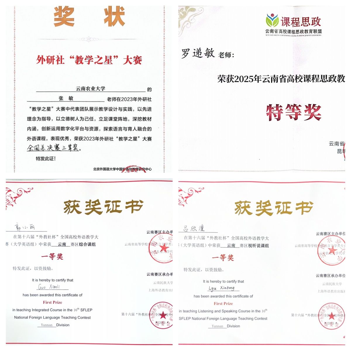 思政铸魂育新人。坚守立德树人根本任务,构建“大思政”育人格局,推动思政与外语教学、实践育人融合,党委书记、院长带头讲授思政第一课。夯实思政队伍,配齐配强辅导员、班主任,1名教师被表彰为2024年度“云南省最美高校辅导员”。开展“语说云农”系列活动,建成省、校级课程思政示范课9门,立项课程思政项目省级4项、校级9项,斩获课程思政类教学比赛全国奖项1项、省级奖项1项、校级奖项6项,3个案例入选全国农林院校课程思政优秀案例。组织师生赴西南联大博物馆开展爱国主义教育、赴临沧云县开展暑期“三下乡”、赴腾冲开展“行走边关”等实践活动,与保山学院马克思主义学院携手实施滇缅公路情景剧双语课程思政建设项目。