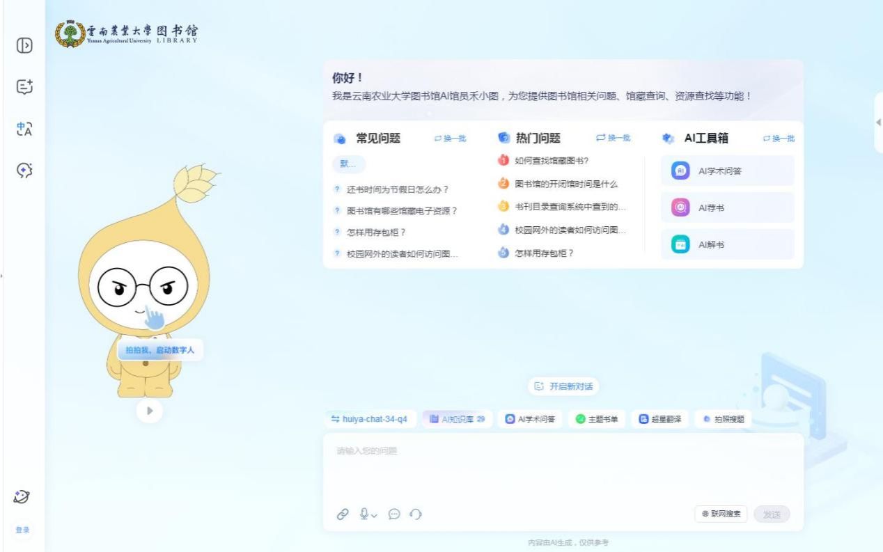 图书馆主动融入AI技术,引入AI馆员数字交互系统,打造了具备语音交互能力的AI虚拟馆员,提供7×24小时不间断服务。师生可随时咨询借阅规则、查询馆藏、获取资源推荐与智能检索,AI馆员快速响应、精准解答,打破时空限制,让师生拥有专属“私人咨询顾问”。这一举措推动服务从“被动响应”转向“主动服务”,让智慧服务更有温度。