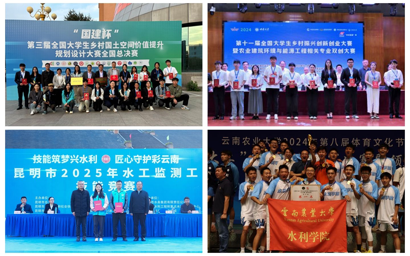 学生参加各级各类竞赛屡创佳绩:2023年获全国挑战杯大赛二等奖1项,为学校建校以来在该项赛事上的最好成绩;获全国大学生水利创新设计大赛特等奖、全国大学生空间信息应用大赛一等奖、全国大学生数学建模竞赛二等奖,均为西南地区高校最高奖或学校近年来最好成绩。2024年获全国大学生农业水利类创新大赛特等奖、全国大学生乡村国土空间规划大赛特等奖,均为西南地区高校最高奖;同年获全国大学生土地整治创新设计大赛一等奖。2022年获全国大学生农业水利创新设计大赛特等奖、第二届全国生态保护竞赛全国总决赛一等奖。2021至2024年连续获全国大学生BIM创新大赛一等奖,在全省水利高等教育院校中名列前茅。