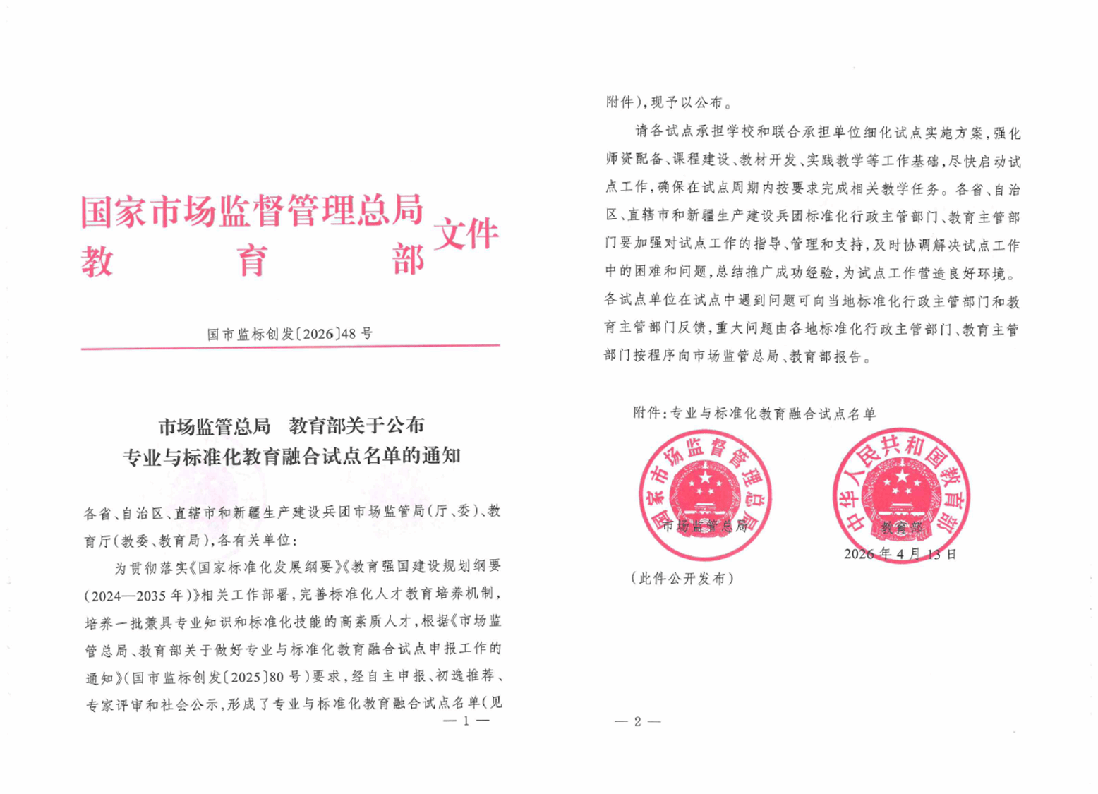 本站消息 近日,国家市场监督管理总局、教育部联合印发《关于公布专业与标准化教育融合试点名单的通知》(国市监标创发〔2026〕48号),学校成功获批专业与标准化教育融合试点单位。此次试点旨在深入贯彻落实《国家标准化发展纲要》和《教育强国建设规划纲要(2024—2035年)》,加快培养兼具专业知识、标准化理念和实践能力的高素质复合型人才。