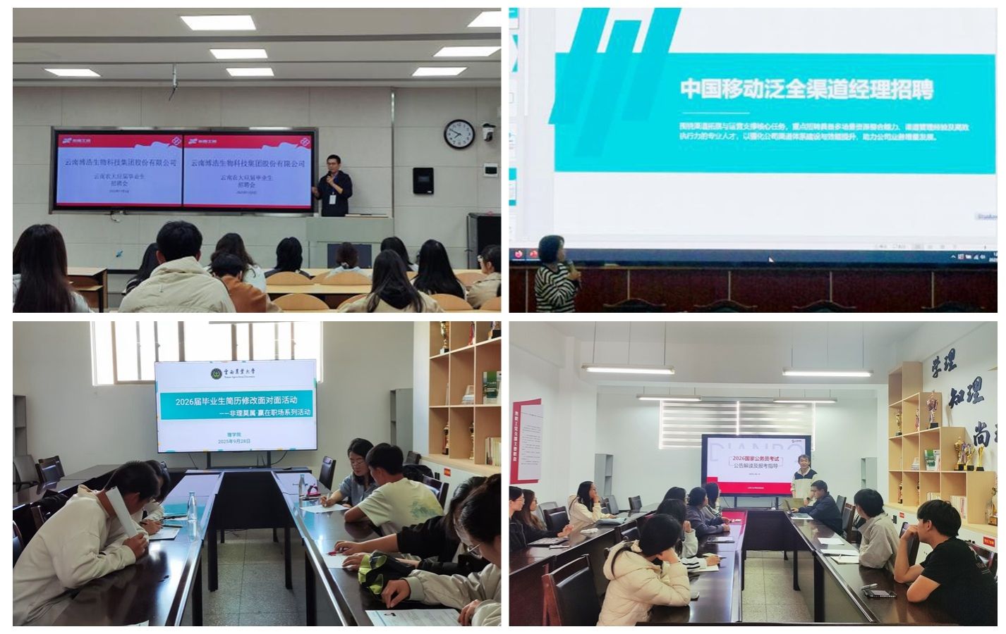 学院精准对接企业资源,邀请云南移动盘龙分公司、云南博浩生物科技等企业进校园开展专场招聘,现场接收简历,为毕业生提供精准岗位选择。同时,联动专业机构专家,面对面指导毕业生优化简历、点对点助力国考选岗,针对性破解求职痛点,提升求职与报考竞争力。