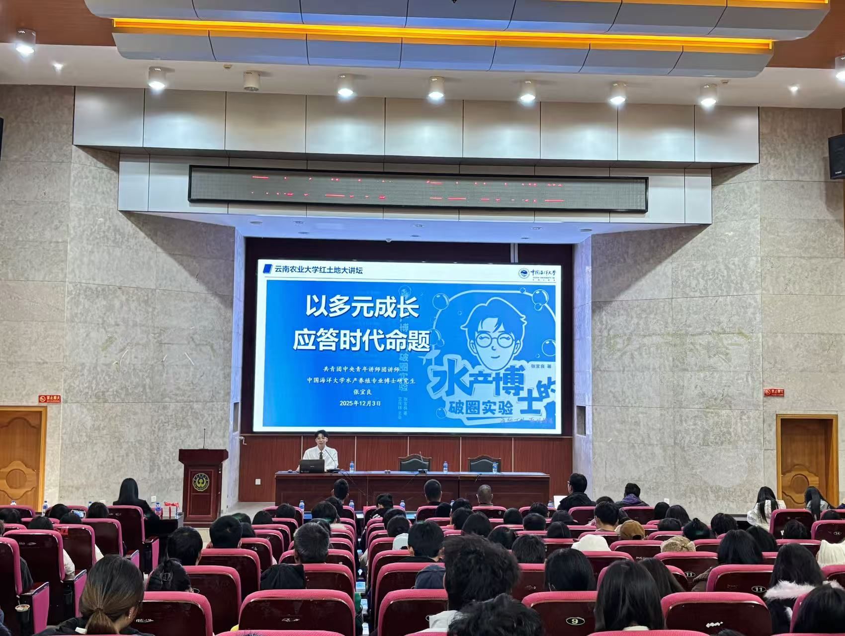 张宜良博士做“以多元成长应答时代命题”的主题分享,从“养不出母鱼毕不了业”的案例为引,结合自身水产科研、助农科普、新媒体传播的复合经历,拆解“专业扎根”和“实践破圈”的成长路径,让云农学子直观感受青年以专业所长服务社会的广阔空间。分享结束后,互动提问环节氛围热烈,同学就专业选择、科研方向、新媒体科普内容创作等问题踊跃提问,张宜良博士结合自身经历逐一回应,提供可落地的成长指引。