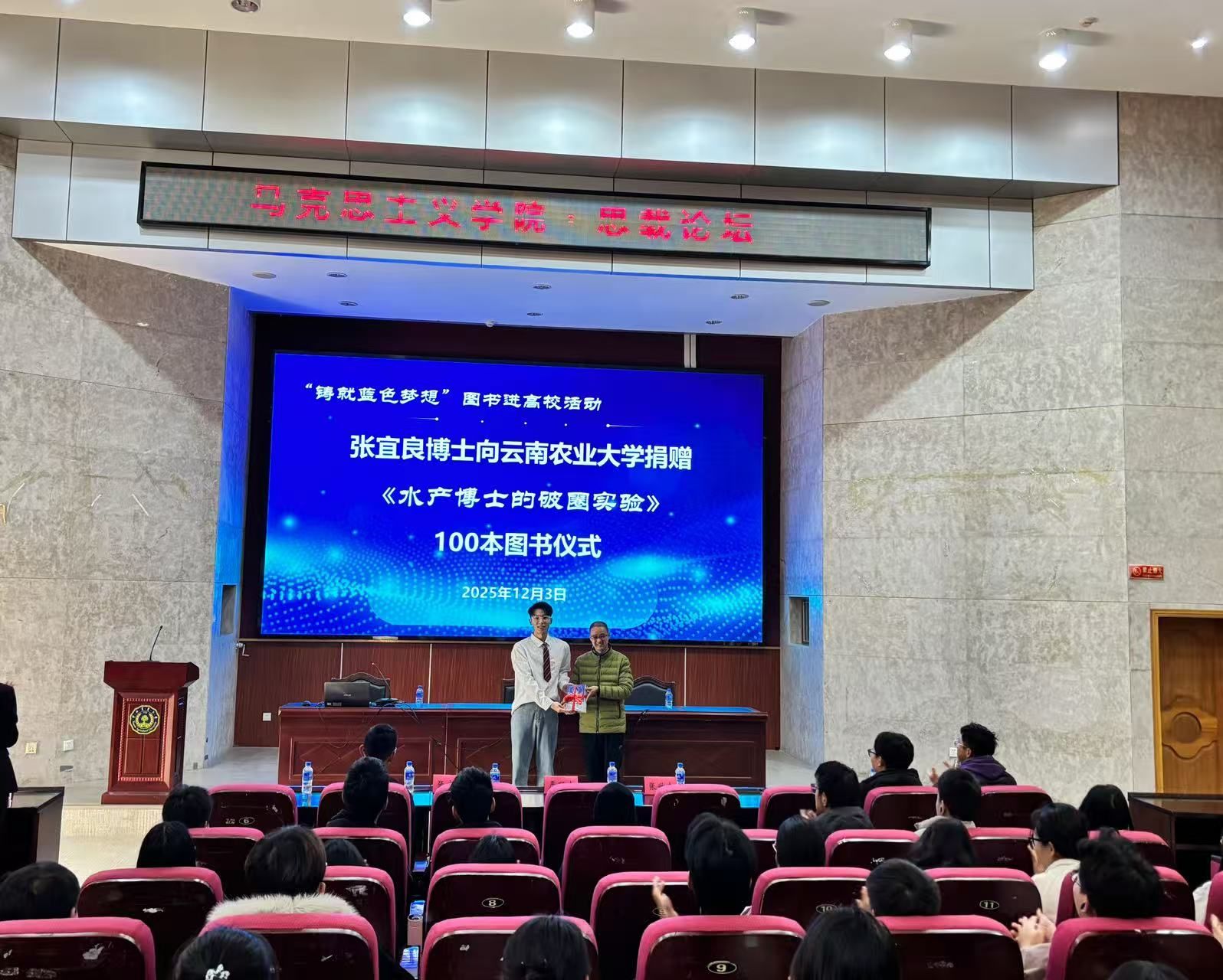 活动尾声,张宜良博士向学校捐赠个人专著《水产博士的破圈实验》100册,通过“铸就蓝色梦想”图书进高校活动进一步拓宽学子视野,搭建起青年榜样与农科学子之间的交流桥梁,激励广大云农学子以更开阔的思维、更务实的行动投身专业学习与社会服务,为推进农业现代化和乡村振兴贡献青春力量。