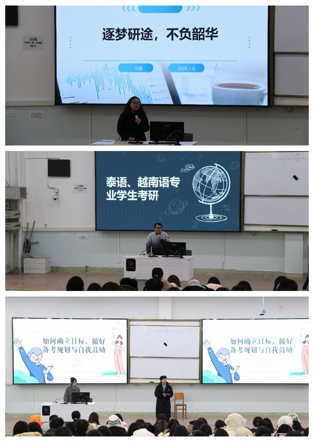 英语系、东南亚语系相关负责老师分别围绕英语、翻译、越南语、泰语等专业,从备考规划、择校策略、时间统筹、应试技巧及心态调适等方面开展系统全面的备考指导。学院学生中心负责老师从心理学角度进行了有针对性的考研规划指导。