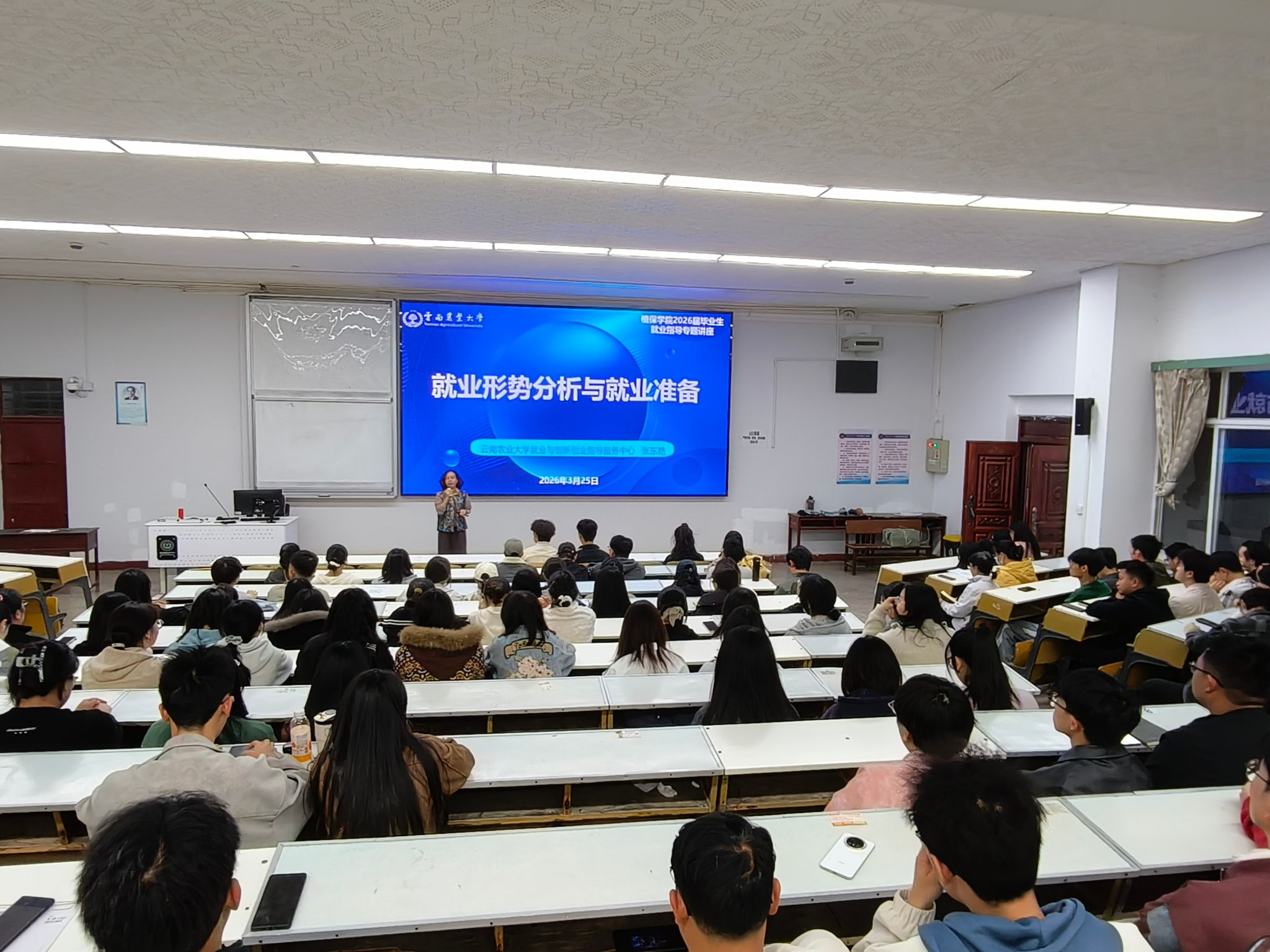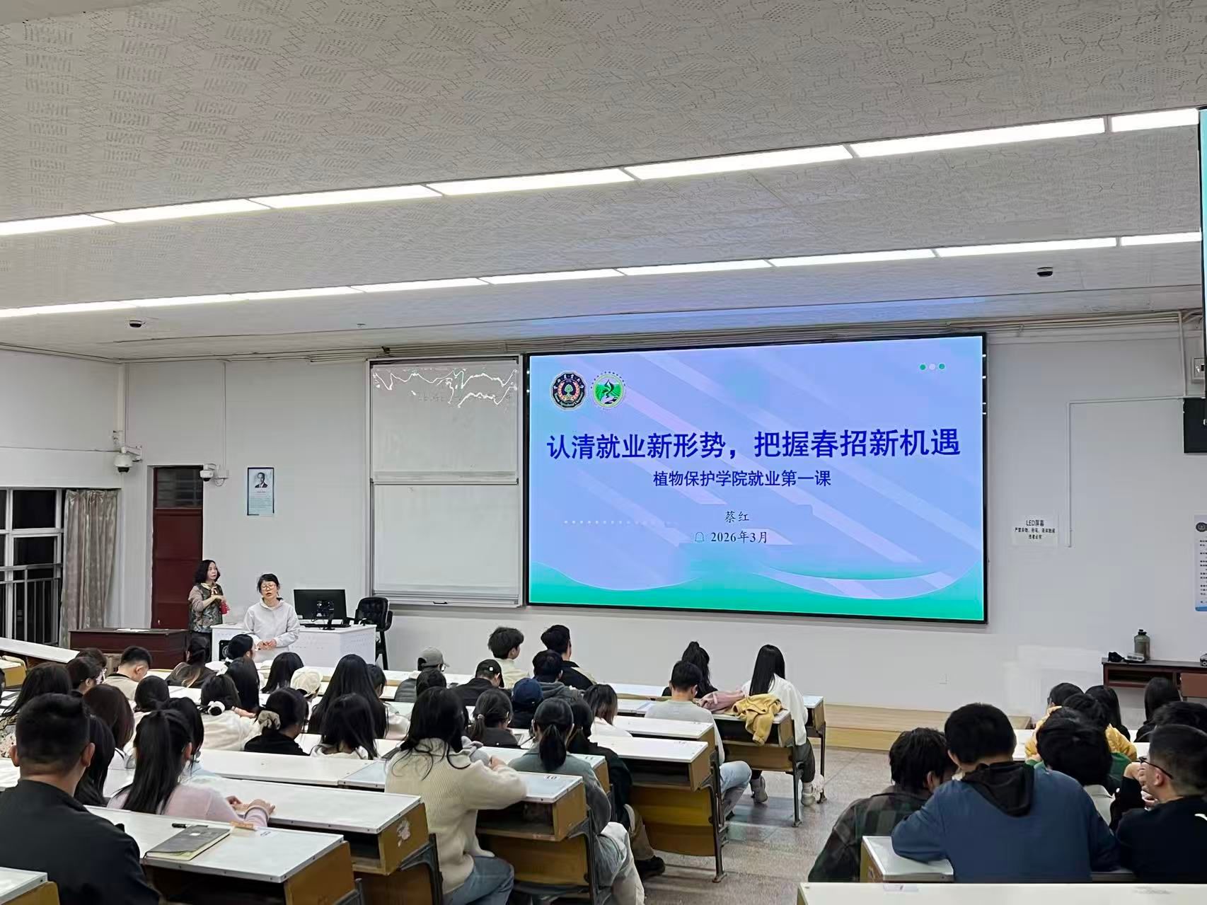 学院领导以“认清就业新形势,把握春招新机遇”为题为 2026 届毕业生讲授就业第一课。她结合行业发展与就业形势,引导学生树立正确择业观,抢抓春招机遇,主动转变观念、提升能力,将个人发展融入农业植保与乡村振兴事业,同时要求低年级学生提前规划、夯实基础,做好就业准备。
