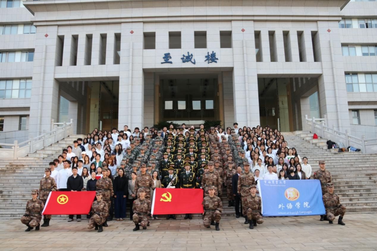 本站消息 4月7日,外语学院师生在至诚楼前举行主题升旗仪式。学院领导、相关师生及国旗护卫队员、军事爱好者协会的同学参加升旗仪式。