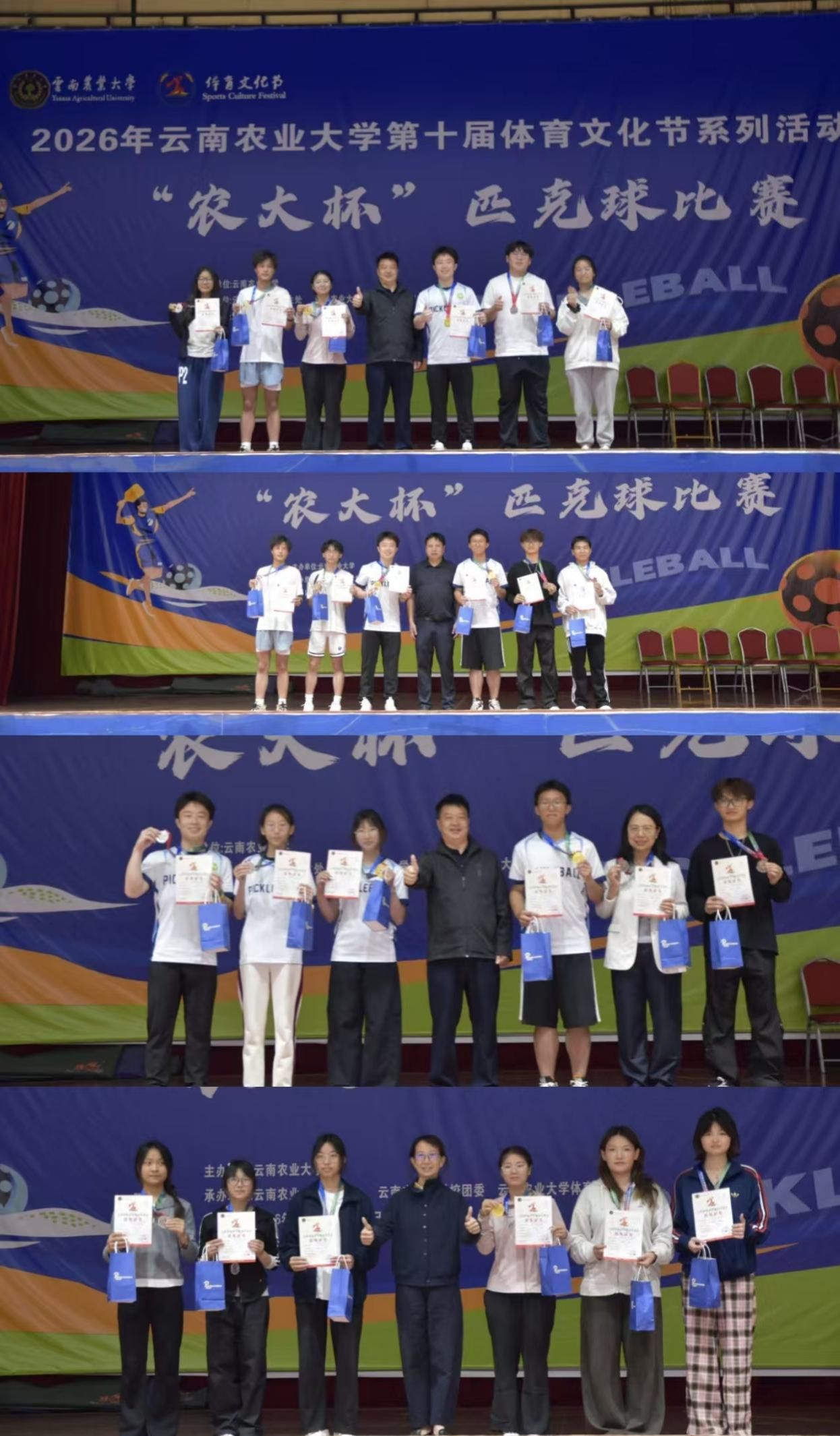本站消息 4月23日至27日,学校第十届体育文化节“农大杯”匹克球比赛在西校区篮球场、文韵堂举行并顺利落幕。本次赛事由学校主办、体育学院承办,首次将匹克球纳入“农大杯”赛事体系,累计吸引全校各学院师生2100余人次踊跃报名参赛,完成比赛1500余场,为目前云南省规模最大的高校匹克球赛事。