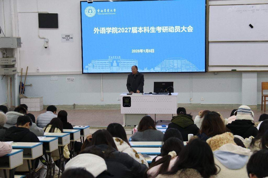本站消息 1月6日,外语学院在明理楼阶梯教室召开2027届本科生考研动员大会。学院领导、系主任和2023级本科生及其班主任、辅导员参加会议。副院长吴广平主持会议。会上,学院党委书记黎文结合近年来毕业生就业创业...