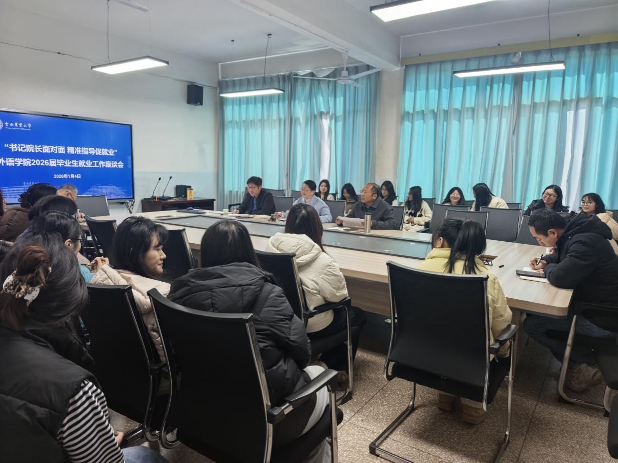 本站消息 1月4日,外语学院以“院长书记面对面,精准指导促就业”为主题召开2026届毕业生就业工作座谈会。院党委书记黎文、院长张吟松和2026届全体毕业生及其班主任、辅导员、帮扶教师参加座谈会。座谈会由学院党...