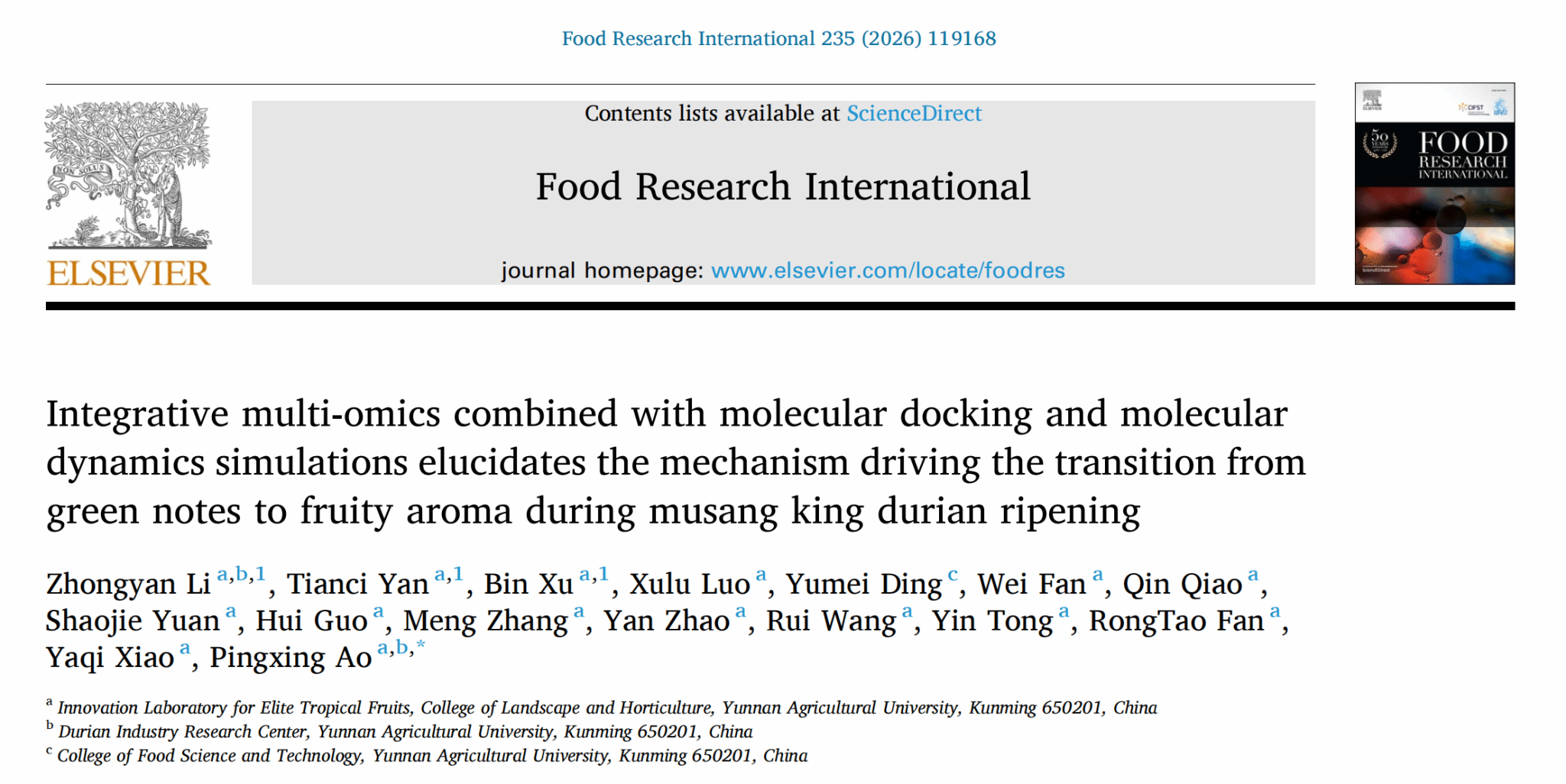 本站消息 近日,学校园林园艺学院敖平星博士团队在国际权威期刊《Food Research International》(中科院1区TOP;IF5yeah = 8.5)发表题为“Integrative multi-omics combined with molecular docking and molecular dynamics simulations elucidates the mechanism driving the transition from green notes to fruity aroma during Musang King durian ripening”的研究论文,该研究系统分析了猫山王榴莲在成熟过程中风味的演变,...