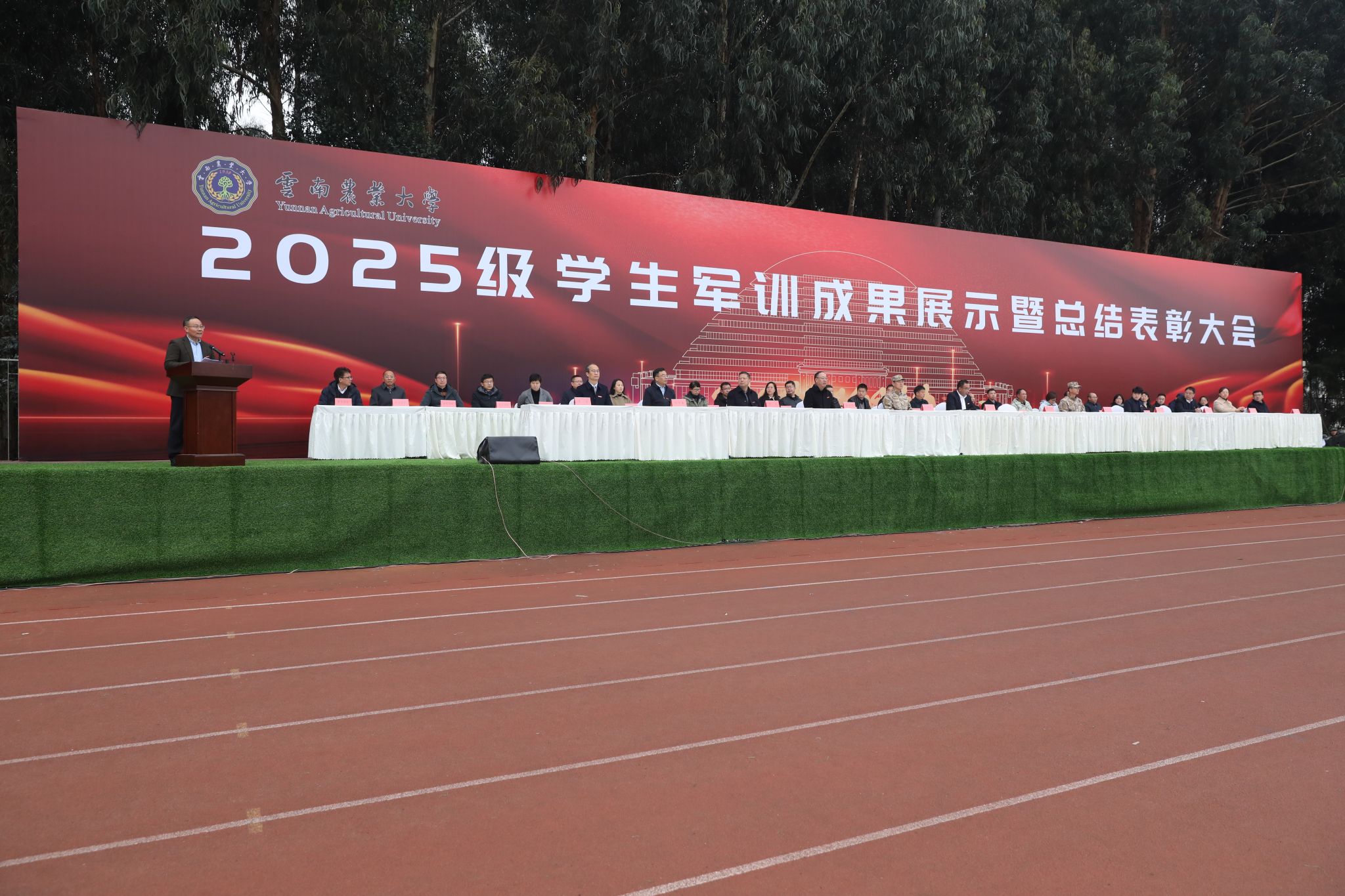 本站消息 12月23日,学校2025级新生军训开训动员大会在东校区田径运动场隆重举行。盘龙区人民武装部上校部长彭庚、中国人民解放军云南省军区直属队、95668部队教官,校党委副书记、校长李永和,校党委副书记黄鹤平,副校长张慧出席大会。学校相关职能部门负责人,各学院党委书记、党委副书记及负责军训的工作人员,以及6780名参训的2025级新生参加大会。大会由副校长李宏主持。大会在庄严的国歌声中拉开帷幕。李永和为军训团授旗,军训教官覃文丁和大数据学院2025级王双梅同学分别作为教官代表和参训学生代表表态发言。...