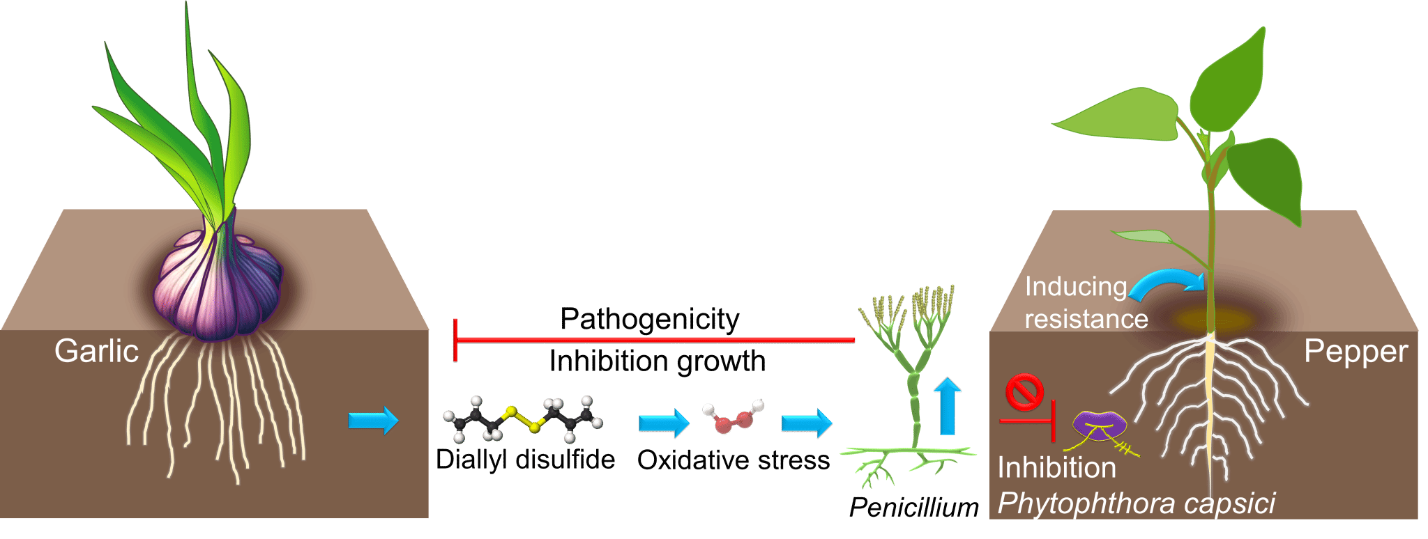 研究揭示了轮作系统中大蒜根际微生物的“利他”机制。大蒜根系释放的DADS可引发ROS介导的选择压力,进而富集耐ROS胁迫的大蒜青霉,在作物轮作系统中形成一种“利他型”微生物组演替模式。该机制表明,通过植物调控微生物群落构建过程,有望实现土传病害的定向治理。此外,已知多种有益微生物(如寡雄腐霉、双核丝核菌、洋葱伯克霍尔德菌等)通常具有寄主偏好性或生态位特异性,未来通过解析这些微生物与植物代谢产物的互作机制,将有助于更精准地设计并增强“利他”效应,推动基于植物-微生物组互作的农业可持续发展。