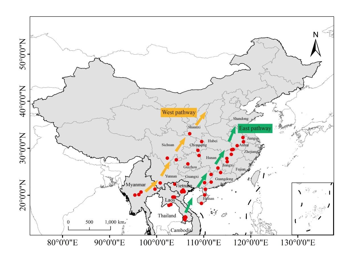 草地贪夜蛾可在东南亚大部分地区(包括缅甸、老挝和越南)以及中国亚热带地区(如云南、广西和海南)越冬,在这些地方全年繁殖的种群很可能在每年春季向北迁飞至中国东部。事实上,在东亚地区,多种昆虫如东方粘虫、甜菜粘虫、稻卷叶螟和稻飞虱等,均存在与草地贪夜蛾类似的季节性远距离迁飞现象。这些昆虫通常沿两条路径迁飞:西线从缅甸和云南出发,经贵州、四川,进入山西、甘肃等地;东线则从老挝、越南和广西出发,最终抵达长江流域、黄淮地区,乃至中国东北。此前,通过探照灯诱虫、轨迹模拟、飞行行为观测和气象资料分析,已初步确认草地贪夜蛾从中南半岛至中国东北的东、西两条迁飞路径。然而,两条路径种群在遗传结构上是否存在差异,能否利用分子标记对其虫源进行区分,仍不明确。