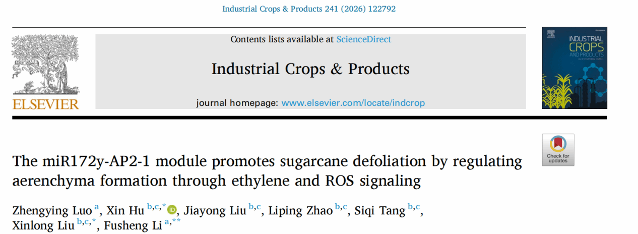 本站消息 1月30日,学校农学与生物技术学院云南省作物生产与智慧农业重点实验室李富生教授团队,联合云南省农业科学院甘蔗研究所热带生物作物育种全国重点实验室刘新龙研究员团队,在农林科学国际TOP期刊《Industrial Crops & Products》(中科院一区,IF=6.2)在线发表了题为“The miR172y-AP2-1 module promotes sugarcane defoliation by regulating aerenchyma formation through ethylene and ROS signaling”的研究论文。