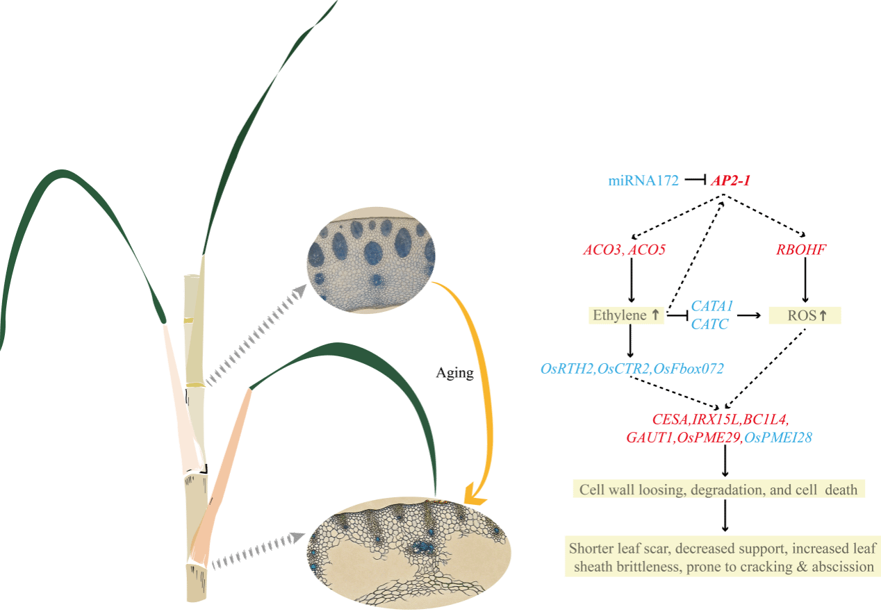 甘蔗是全球重要的糖料和能源作物。在中国,甘蔗多种植于南方丘陵山地,难以大规模机械化收割。人工砍收时,难脱叶品种需要耗费大量劳力剥叶,极大增加了生产成本。因此,培育易脱叶品种是降低收获成本、提升产业效益的关键。然而,甘蔗叶片脱落的调控机制尚未清楚。团队综合运用多组学分析、分子生物学及生理学分析手段,系统比较了易脱叶与不易脱叶甘蔗脱叶过程中的变化。研究发现,甘蔗叶片脱落并非依赖于经典植物中离区结构,而是与叶鞘-茎节连接处通气组织的发育程度密切相关。随着叶鞘成熟,该处薄壁细胞破裂、细胞间隙扩大形成发达的通气组织,导致组织机械强度下降,最终在重力作用下实现叶片被动脱落。研究团队构建了调控叶片脱落的关键分子网络,并鉴定出一个核心调控模块:miR172y-AP2-1。该模块具有明确的时空表达特异性,miR172y直接靶向抑制转录因子AP2-1的mRNA,在转基因水稻中过表达AP2-1,显著促进叶鞘通气组织形成,使其更易人工剥离,且在甘蔗的易脱叶表型中得以重现。该研究首次系统解析了甘蔗叶片自然脱落的内在分子机制,拓展了人们对禾本科植物器官分离机制多样性的认知,同时也为通过分子育种改良甘蔗脱叶性状提供了关键理论依据和新靶点。