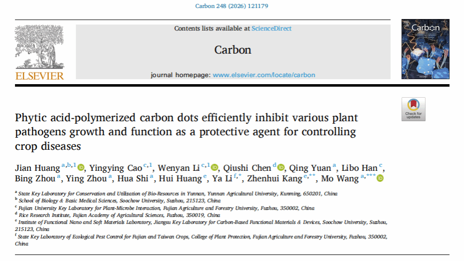 近日,学校植物保护学院王莫课题组在国际著名碳材料期刊Carbon(IF=11.6)上发表题为“Phytic acid-polymerized carbon dots efficiently inhibit various plant pathogens growth and function as a protective agent for controlling crop diseases”的学术文章,系统揭示了植酸碳点纳米材料抑制植物病原真菌和细菌的作用机理及其在作物病害防控中应用潜力。