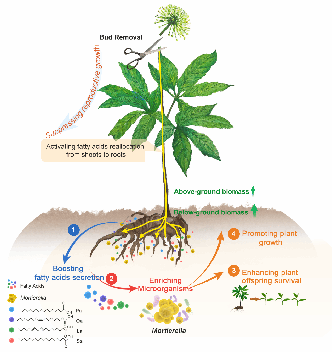 本研究以多年生草本植物三七为模型,发现生殖抑制触发了脂肪酸从地上部向根部的再分配,特异性地富集有益真菌被孢霉,促进植物健康并提升后代适应性。研究揭示了一种植物通过资源重分配激活微生物组介导的生态韧性以补偿生殖成本的进化策略,为多年生作物健康可持续生产提供了全新范式。