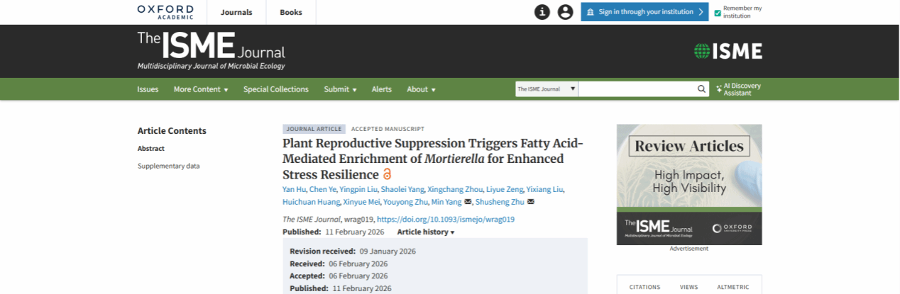 本站消息 近日,学校植物保护学院朱书生教授团队在自然指数期刊,国际微生物生态学顶刊《The ISME Journal》在线发表题为“Plant Reproductive Suppression Triggers Fatty Acid-Mediated Enrichment of Mortierella for Enhanced Stress Resilience”的研究论文。该研究超越传统的植物-微生物互作的“胁迫-信号-招募”框架,首次系统阐明了植物通过“发育调控-资源重分配”这一内源性途径,利用基础代谢产物(脂肪酸)作为“底物”而非“信号”,在根际筛选出竞争优势菌群(Mortierella),进而实现生长与防御协同增益的生态新机制。