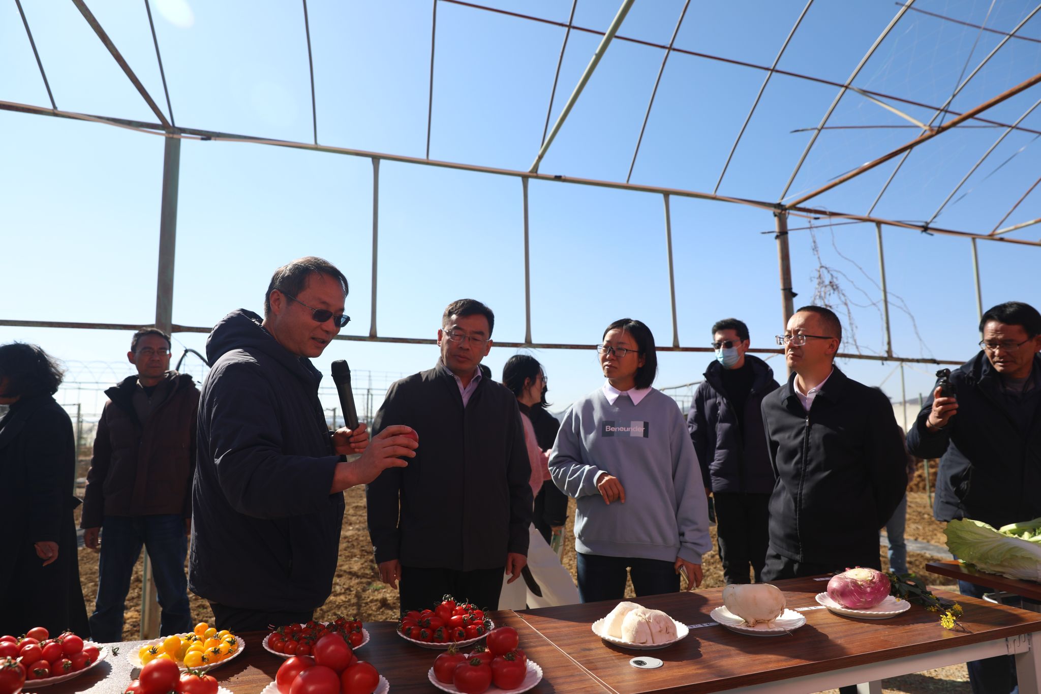 在现场展示环节,学校园林园艺学院十字花科育种团队负责人岳艳玲教授带领与会领导、师生走进田间示范区与产品展示区,近距离观摩蔬菜育种成果的技术细节与示范成效,全面介绍团队科研进展与成果应用前景。观摩结束后,种业创新与特色产业高质量发展座谈会随即召开,与会专家教授、企业代表围绕产学研用深度融合展开深入研讨,为推动蔬菜种业高质量发展建言献策。