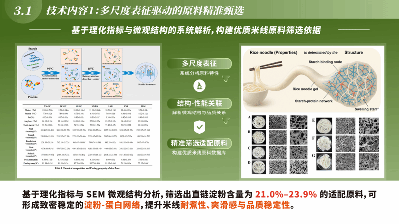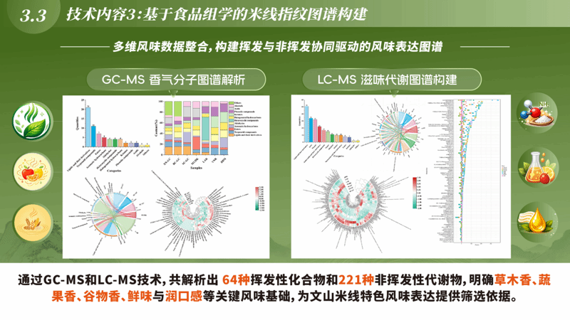在风味研究方面,团队运用GC-MS与LC-MS技术,共解析出64种挥发性化合物和221种非挥发性代谢物,通过梯度提升树模型建立原料特性、工艺参数与消费者感官评分之间的映射关系,为米线品质的稳定可控提供了科学依据。