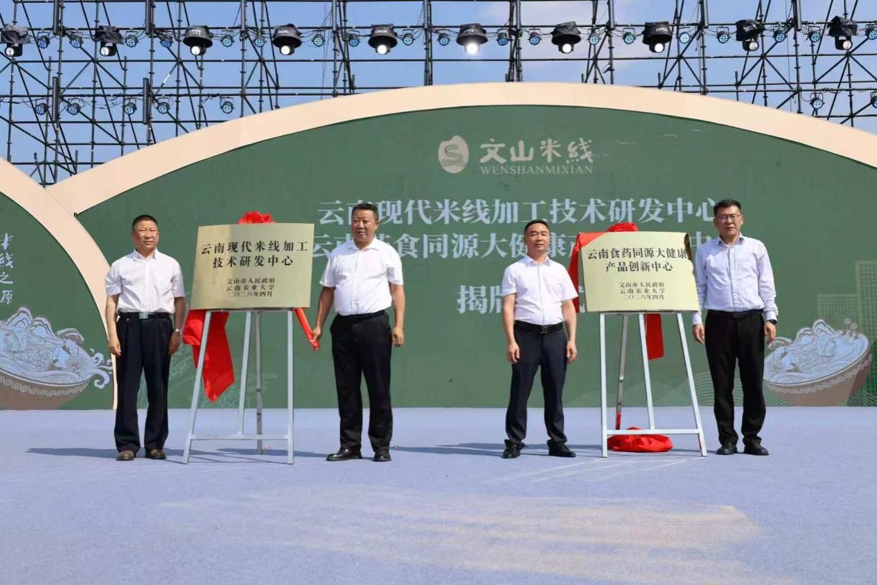 本站消息 4月28日上午,2026年文山早点(米线)文化周在文山市华龙湖广场正式开幕。学校副校长田洋代表学校与文山市人民政府、文山御美堂生物技术开发公司正式签订三方合作协议,同步为“云南现代米线加工技术研发中心”和“云南食药同源大健康产品创新中心”揭牌,搭建起高校、政府与企业协同联动的产业研发平台,标志着校地企协同合作迈入常态化、阵地化的新阶段,为文山米线产业的科技创新提供了持续稳定的技术支撑。