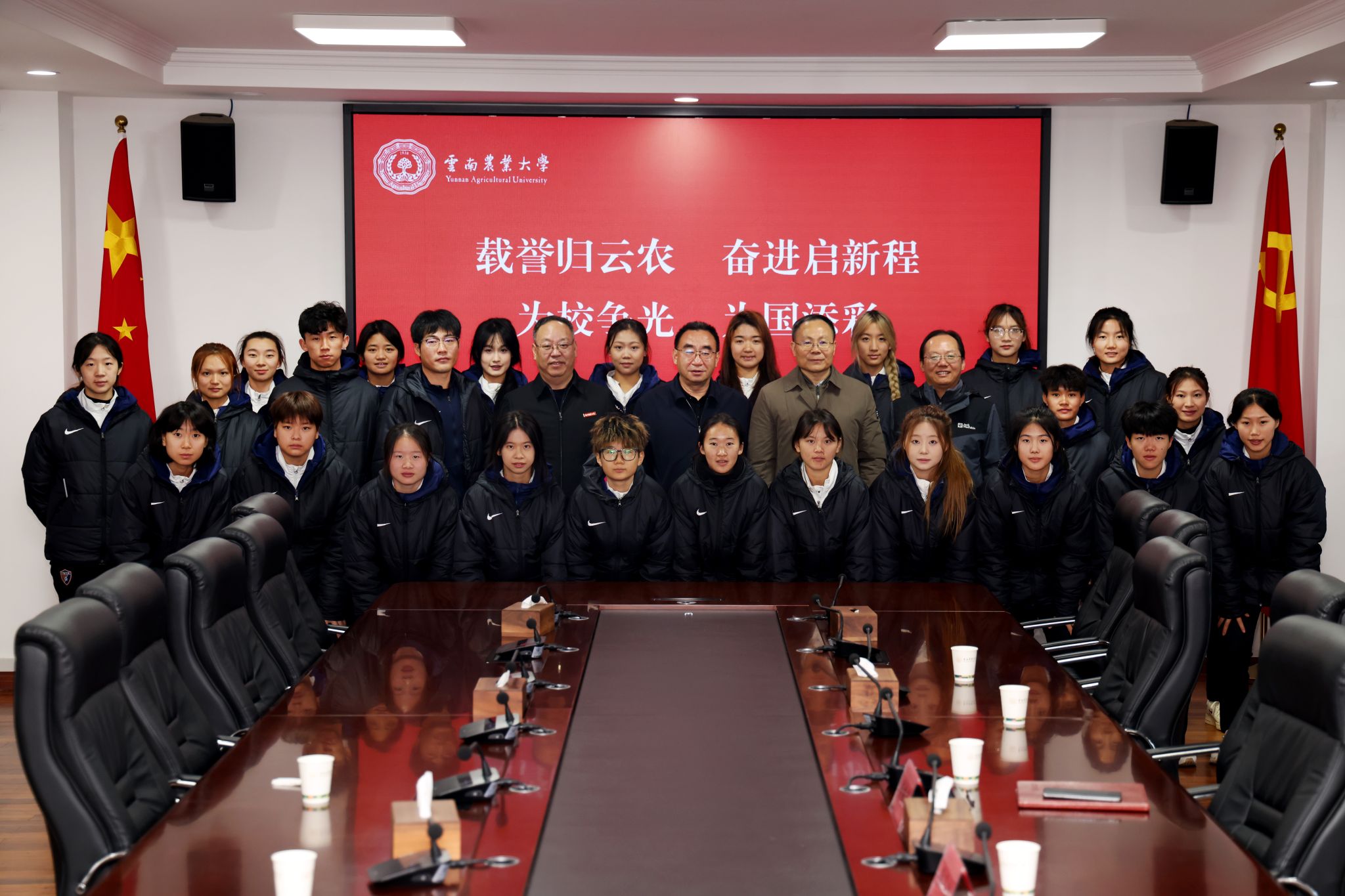 本站消息 11月20日,学校举办“载誉归云农 奋进启新程”座谈会,喜迎全运会冠军龙佳校友载誉返校,共同庆祝学校女子足球队荣获全国季军的优异成绩。校党委书记王卫斌,校党委副书记、校长李永和,校党委副书记黄鹤平,校友龙佳与教练钱秋生指导,校女子足球队教练及队员代表参加座谈。
