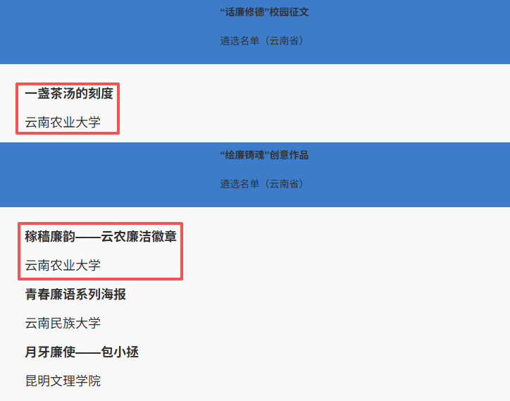 本站消息 近日,教育部网站发布《关于第十届高校廉洁教育系列活动结果的公示》,学校两件作品在全国评选中脱颖而出,其中《一盏茶汤的刻度》入选“话廉修德”校园征文优秀作品,《稼穑廉韵——云农廉洁徽章》入选“绘廉铸魂”创意优秀作品。