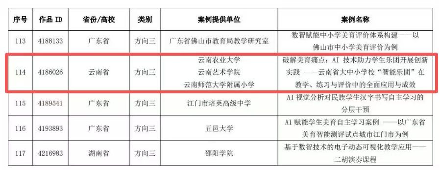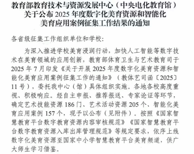 近日,教育部教育技术与资源发展中心(中央电化教育馆)正式公布 2025 年度数字化美育资源和智能化美育应用案例征集工作结果,由学校申报的《破解美育痛点:AI 技术助力学生乐团开展创新实践——云南省大中小学校“智能乐团”在教学、练习与评价中的全面应用与成效》成功入选智能化美育应用案例名单。