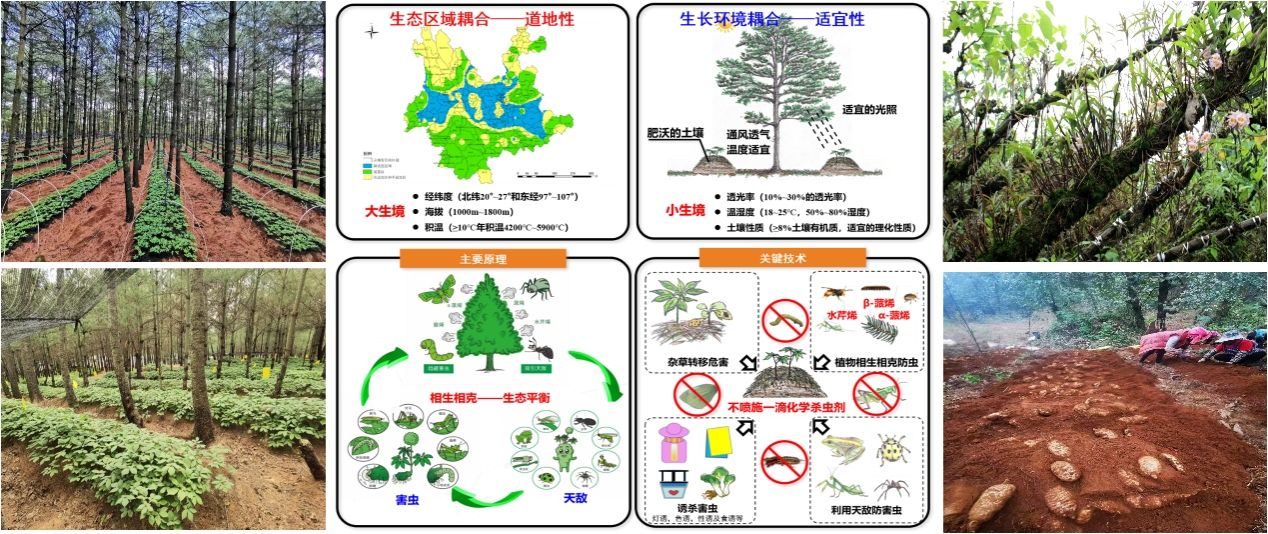 生态种植团队秉持“药效第一、品质优先、绿色健康”的发展理念,充分利用人工商品林和经济林资源,成功构建林下三七、黄精、白及、石斛、天麻、西洋参等中药材生态种植技术体系,制定多项国家和地方技术标准和产品标准,开发出一批以林下绿色药材为原料的药品和食品等新产品,建立覆盖全产业链的药材和产品的追溯及监测系统,示范推广1.5万余亩,形成可复制、可推广的林下有机中药材产业化发展模式。
