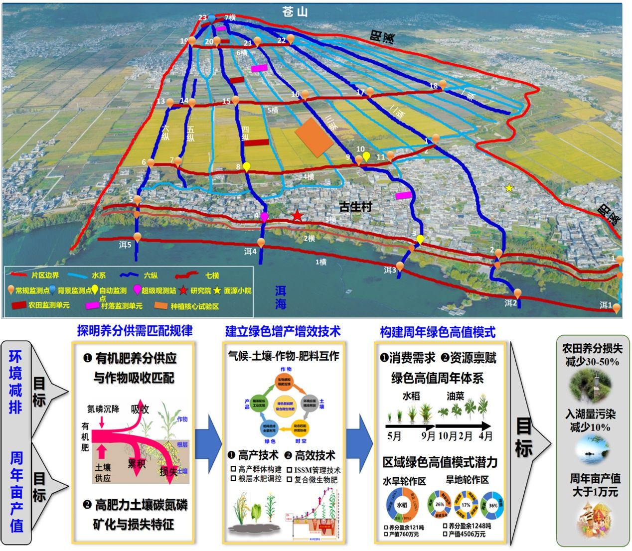 针对洱海流域农业面源污染来源不清和种植体系绿色不高值、高值不绿色两大难题,高原湖泊生态保护团队创新建立了“系统解析、精准防控、生态治理”的污染防控体系和绿色高值协同种植模式。通过构建监测网络,精准解析污染来源,提出“控制1次基肥、拦截2股水、构建3道防线” 的综合防控策略,实现农田氮磷减排30-50%、入湖负荷减10%以上。在此基础上,创新水稻、烤烟、玉米、油菜、蔬菜等作物专用绿色智能肥与水肥一体化技术。2024年相关技术示范推广面积中,水稻达5.5万亩、烟草3.05万亩、蔬菜0.1万亩,实现环境减排20%–50%,亩均降本增收600–2000元,走出了一条生态优先、绿色发展与产业增效互促共赢的新路子。