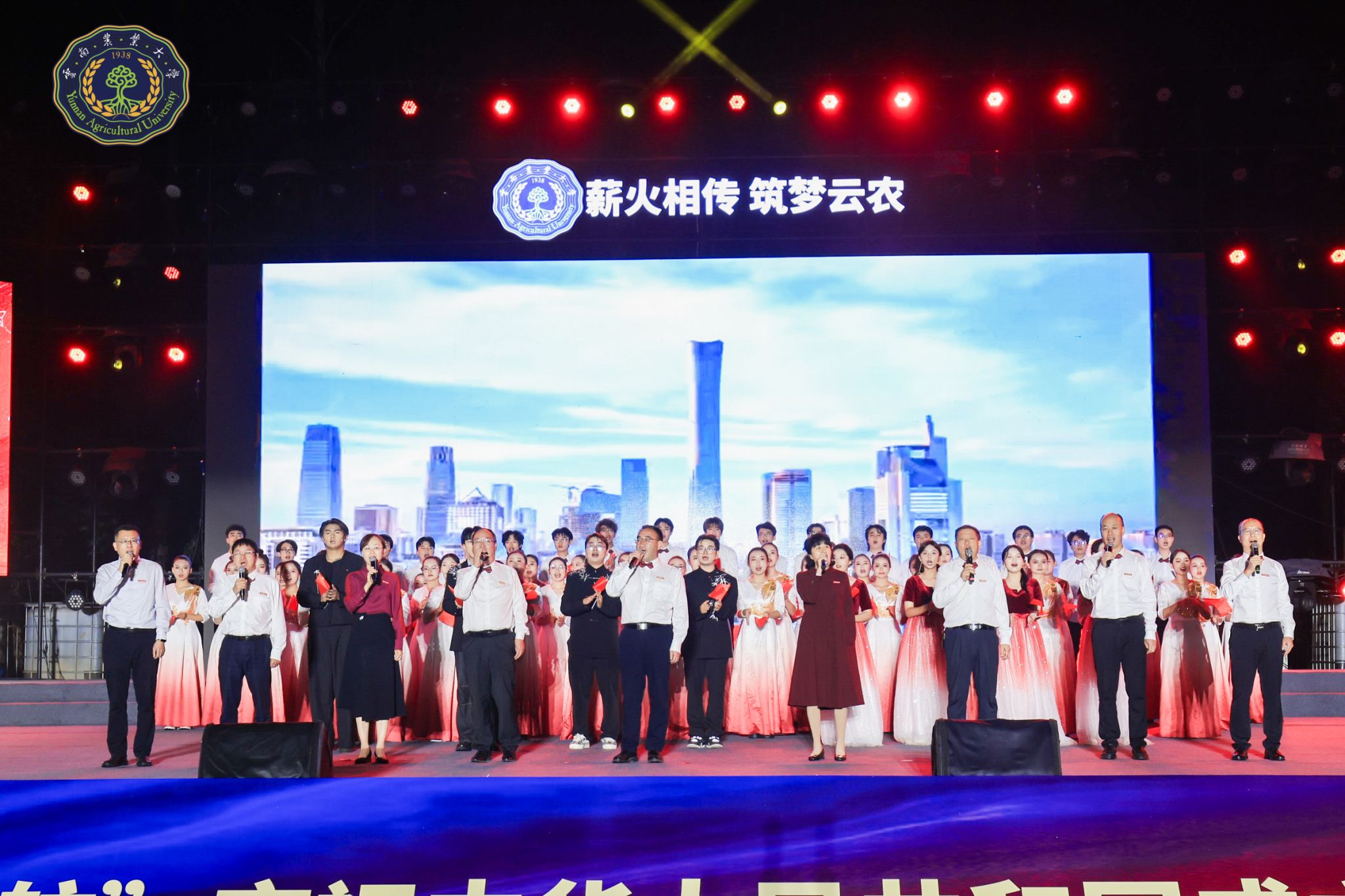 最后,晚会在学校党委王卫斌书记等校领导及学生共同演绎的《我爱你中国》《歌唱祖国》大合唱中落幕。