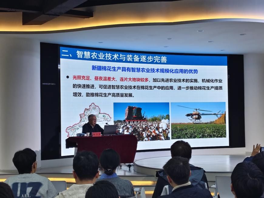 报告中,陈学庚院士围绕我国粮棉果产业现状、智慧农业技术与装备发展及团队最新研究成果展开系统阐述。他全方位解读新疆棉花品种种植、农艺与农机融合模式及世界地位,展示从传统农机到智能农机的发展历程与北斗导航在棉花生产中的应用;还分享团队研发的棉花水肥一体化、膜下滴灌、草木回收及红枣、苹果作物智能生产等关键技术与装备。