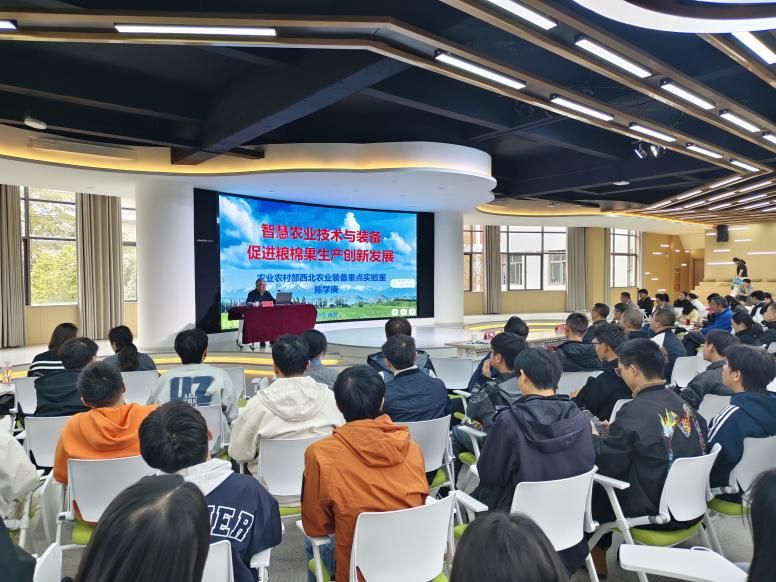 本站消息 10月23日下午,中国工程院院士、农业机械设计制造专家陈学庚应邀做客学校“红土地”大讲堂,在学生社区共享交流厅作“智慧农业技术与装备——促进粮棉果生产创新发展”学术报告。报告由机电工程学院院长杨文彩主持,全校近200名师生聆听。