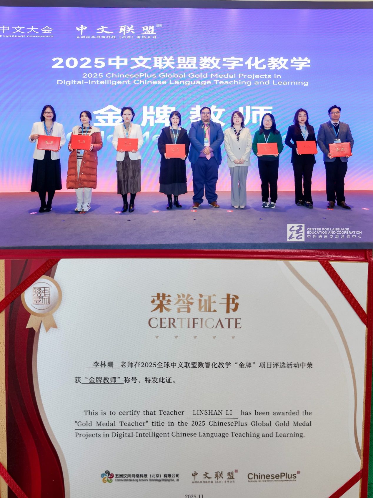 学校教师李林珊在2025全球中文联盟伙伴大会上获得2025全球中文联盟数智化教学“金牌教师”称号。