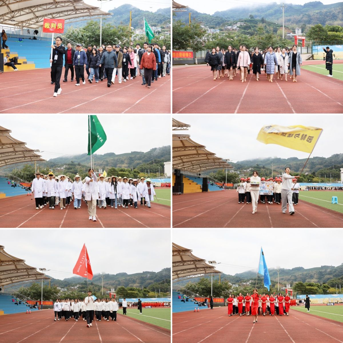 国旗护卫队、裁判员及各系部方阵、表演方队依次入场,有序站位。随着雄壮的国歌声响起,五星红旗在全体师生的注目礼中缓缓升起。